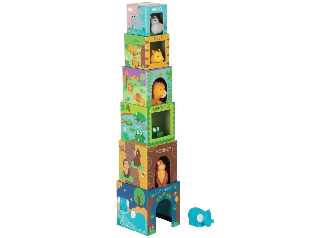 Poskladajte kocky na seba a vytvorte tak najväčšiu vežu! Každá z týchto 6 pestro potlačených kociek má svoje vlastné okienko a príslušného obyvateľa - exotické zvieratko z ďalekých púští a pralesov! Vďaka skladnosti a zvolenému materiálu je možné zvieratká využiť ako spoločníkov pri cestách alebo kúpaní (kartón nesmie prísť do styku s vodou). Hlavné vlastnosti: rozvíja motoriku a predstavivosťpodporuje koordináciu ruka-oko a celkovú zručnosťtvorí vzťah k zvieratám a prírode Značka a certifikát FSC® (Forest Stewardship Council) zaručuje, že drevo, z ktorého bol výrobok vyrobený, nebolo vyťažené nelegálne a pochádza z lesov obhospodarovaných šetrným či prírode blízkym spôsobom, v ktorom sú dodržiavané prísne environmentálne a sociálne požiadavky. Značka FSC® na výrobku znamená, že svojim nákupom pomáhate chrániť lesy a podporujete šetrné, zodpovedné či prírode blízke hospodárenie, vďaka ktorému sú naše lesy stabilnejšie, zdravšie, majú prirodzenú druhovú skladbu a lepšie odolávajú negatívnym následkom klimatických zmien.Dodatočné parametre