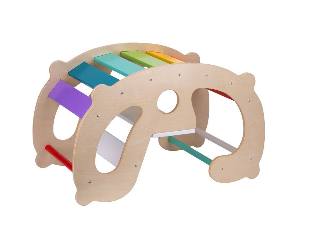 Prečo je hojdačka 2 v 1? Hojdanie nie je jej jediná super vlastnosť. Pri obrátení je z nej totiž bezva dráha! Deti tak môžu šplhať po dúhových rebrinách či hojdačku všemožne preliezať - tieto aktivity potom rozvíja motorické zručnosti, rovnováhu či koordináciu pohybu. Vďaka trendy dizajnu, ktorý kombinuje prírodné drevo s farbami dúhy, sa hodí aj do každého interiéru! Výrobok vyžaduje montáž dospelej osoby. Dodáva sa s detailným návodom na zostavenie (CZ, SK, EN). Hlavné vlastnosti: multifunkčné vlastnostinosnosť max. 50 kgtrénuje motoriku a rovnováhudizajn vhodný do každého interiéruvyužitie aj v pohybovej terapii Značka a certifikát FSC® (Forest Stewardship Council) zaručuje, že drevo, z ktorého bol výrobok vyrobený, nebolo vyťažené nelegálne a pochádza z lesov obhospodarovaných šetrným či prírode blízkym spôsobom, v ktorom sú dodržiavané prísne environmentálne a sociálne požiadavky. Značka FSC® na výrobku znamená, že svojim nákupom pomáhate chrániť lesy a podporujete šetrné, zodpovedné či prírode blízke hospodárenie, vďaka ktorému sú naše lesy stabilnejšie, zdravšie, majú prirodzenú druhovú skladbu a lepšie odolávajú negatívnym následkom klimatických zmien.Dodatočné parametre