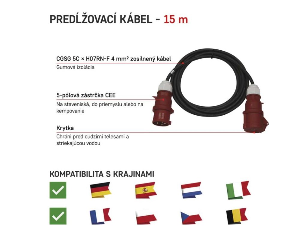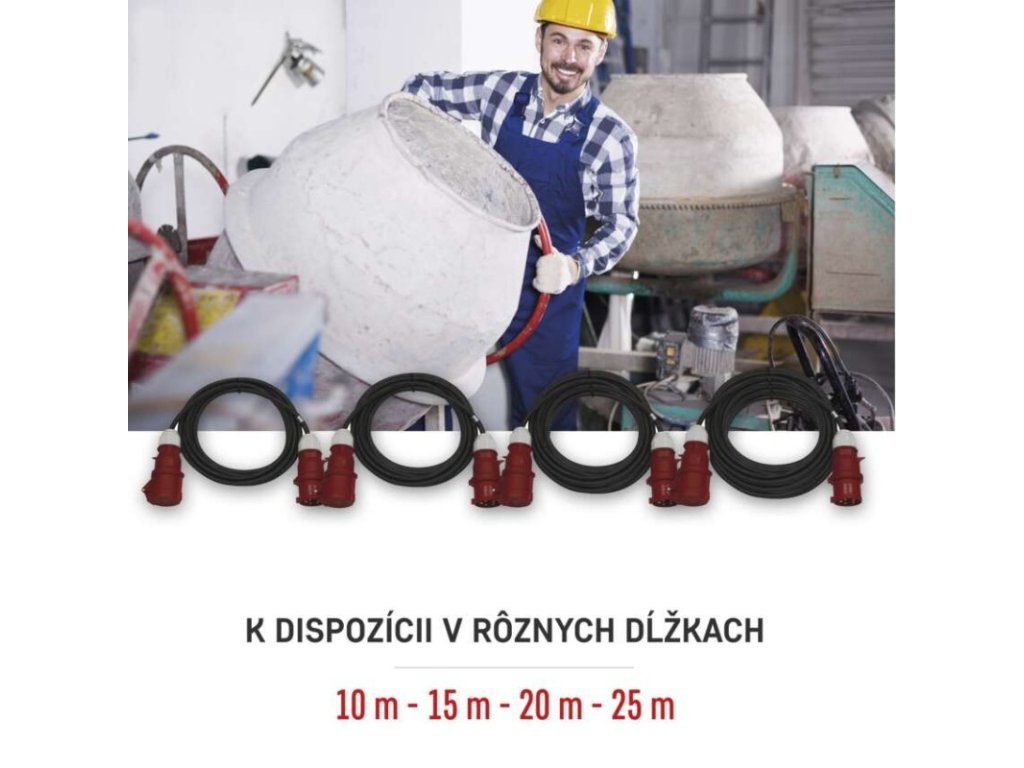 3 fázový vonkajší predlžovací kábel 15 m / 1 zásuvka / čierny / guma / 400 V / 4 mm2