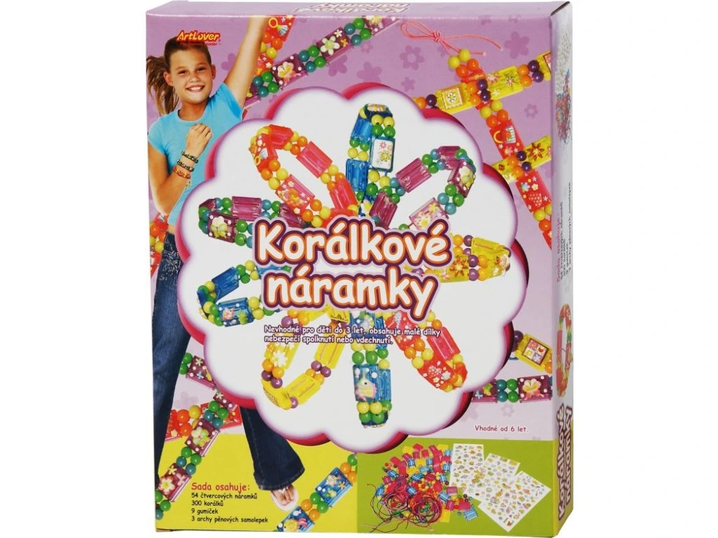 Zábava pro všechny malé parádnice! Vyrob si originální doplňky na ruce dle své fantazie. Postup: 1. Protáhněte gumičku korálkem. 2. Přidávejte korálky. 3. Stejným způsobem vytvořte celý náramek, nakonec ukončete podle obrázku. 4. Na zbylý konec přivažte také korálky. 5. Nakonec ozdobte samolepkami. Obsah balení: - 54 čtvercových náramků - 300 korálků - 9 gumiček - 3 archy pěnových samolepek Vhodné pro děti od 6 let.Dodatočné parametre