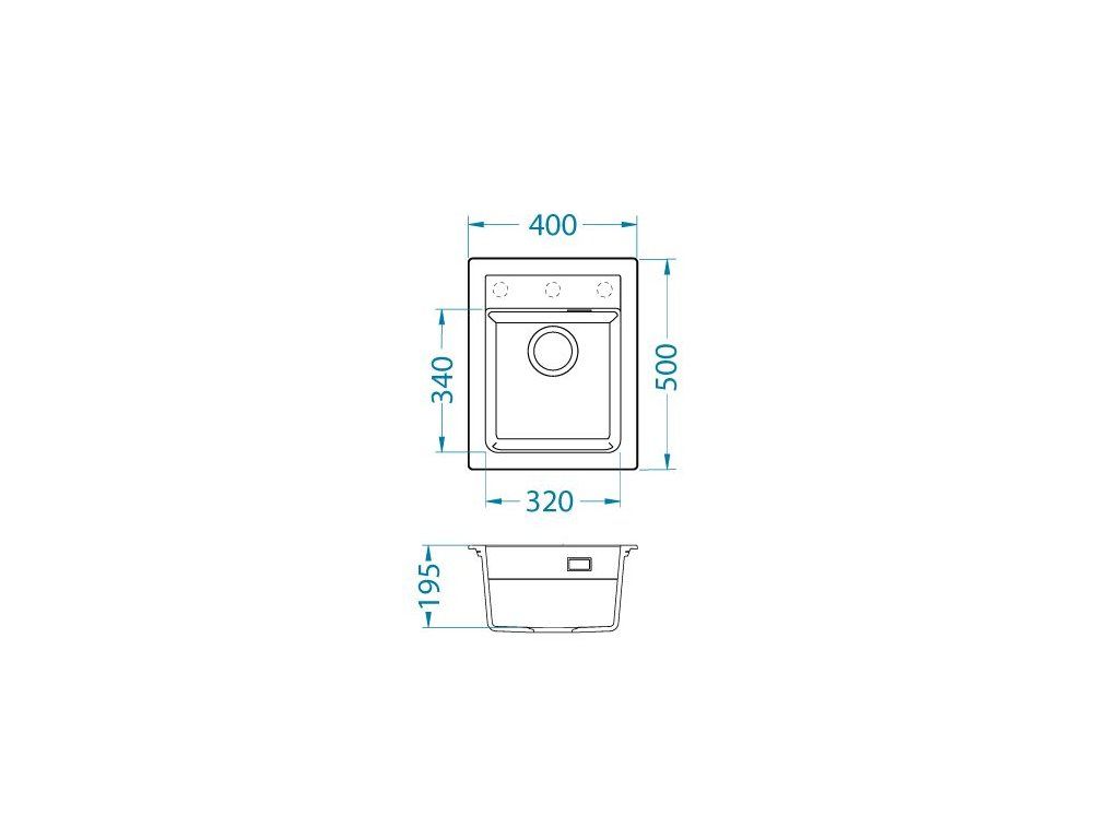 Vestavěný dřez, univerzál. Provedení : granitový dřez bez odkapu Vnější rozměr: 400 x 500 mm Rozměr vaničky: 320 x 340 x 195 mm Sítkový ventil 3 1/2 s přepadem, sifon pro úsporu místa s odbočkou na myčku Úchyty pro upevnění dřezu v balení Předfrézované otvory pro baterii a dávkovač Návod pro instalaci v obrázcích na obale Instalace do skříňky při montáži: I- o šířce 450 mm, U- o šířce 600 mm Váha: 12,5 kg Rozměr balení (mm): 598x584x263Dodatočné parametre