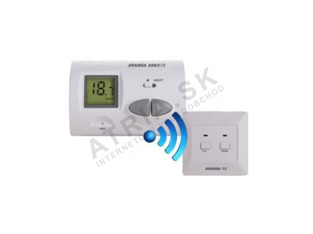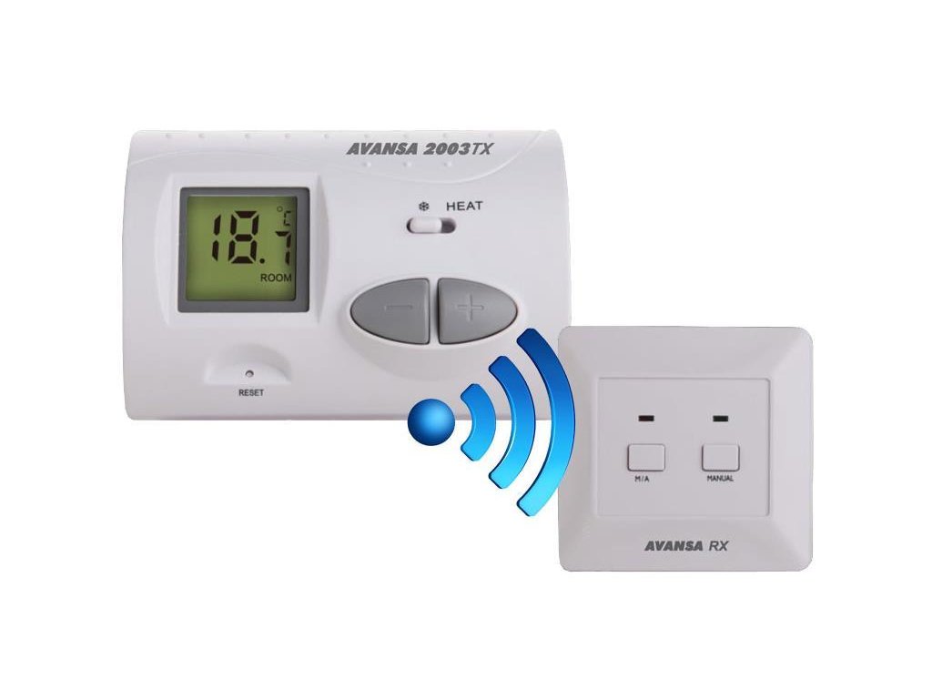 Avansa 2003 TX je bezdrátový neprogramovatelný pokojový termostatvhodné pro ovládání většiny kotlů prodávaných v zemi. Termostat lze snadno připojit ke kotli nebo klimatizaci s provozním napětím 24-230 V. Digitální displej termostatu Avansa 2003 TX umožňuje přesnější měření teploty a nastavení požadované hodnoty ve srovnání s jednoduchými tradičními termostaty. Na základě zvolené citlivosti zapnutí může termostat zapnout kotel pod nastavenou teplotou a vypnout nad nastavenou teplotou. Díky vysoké úrovni komfortu zajišťuje také snížení nákladů na energii. Zařízení má dvě jednotky. První je řídicí jednotka (termostat), druhá slouží k ovládání kotle. Jednotky jsou propojeny rádiovou frekvencí, takže není třeba budovat kabeláž mezi termostatem a kotlem. Termostat a přijímač mají vlastní bezpečnostní kódy, takže vnější signály nemohou narušit jejich bezpečný provoz.