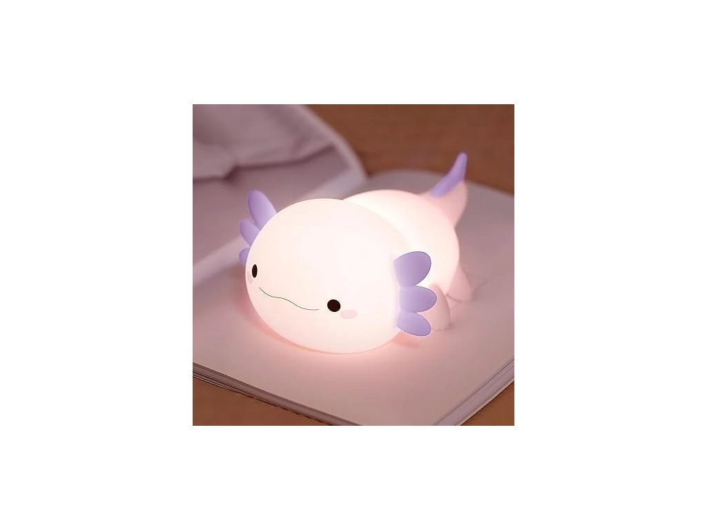 Jemné ovládanie dotykom/poklepaním a 3-stupňové nastavenie jasu: toto svetlofialové silikónové dotykové svetlo s motívom axolotla ponúka intuitívne ovládanie!