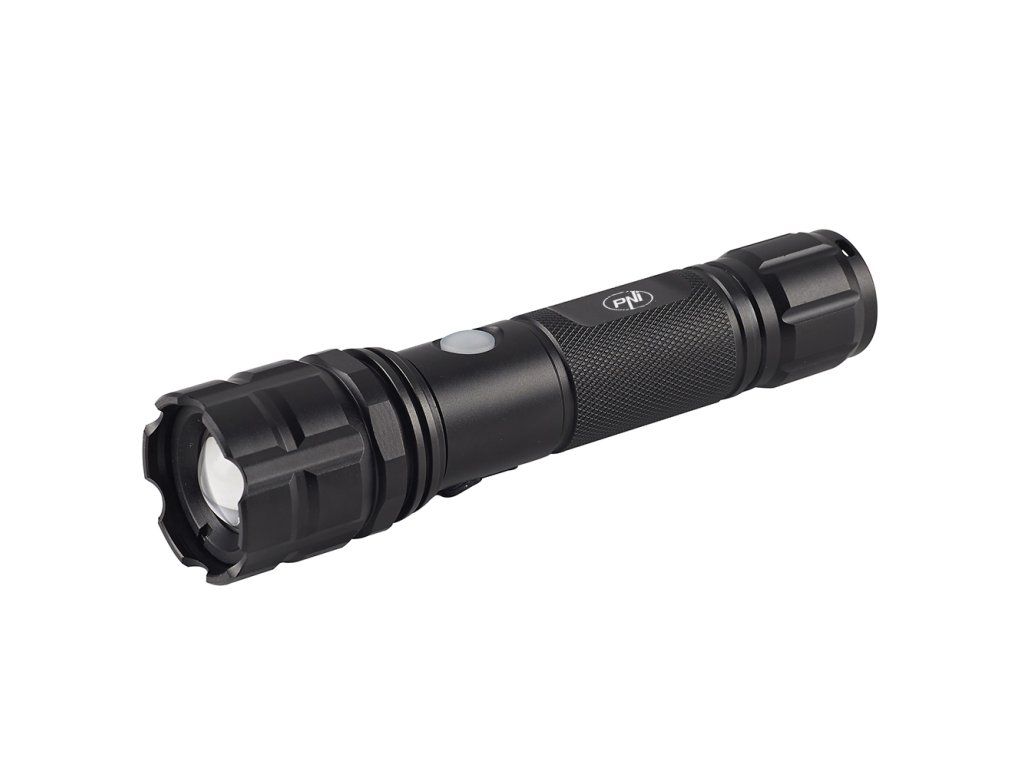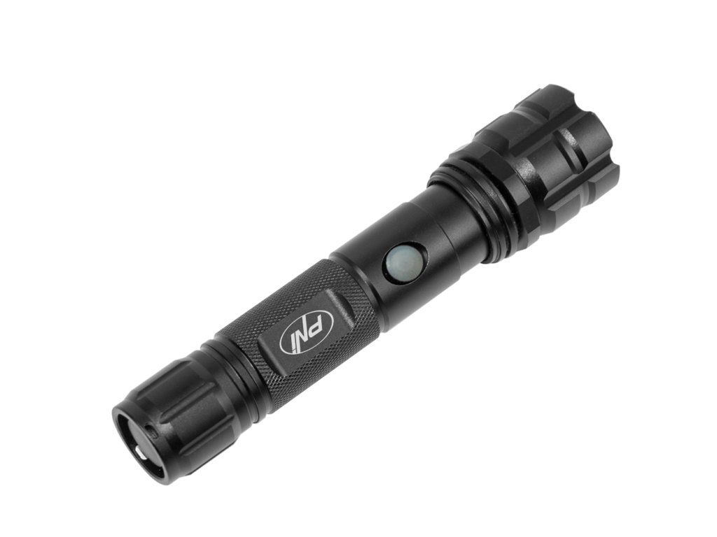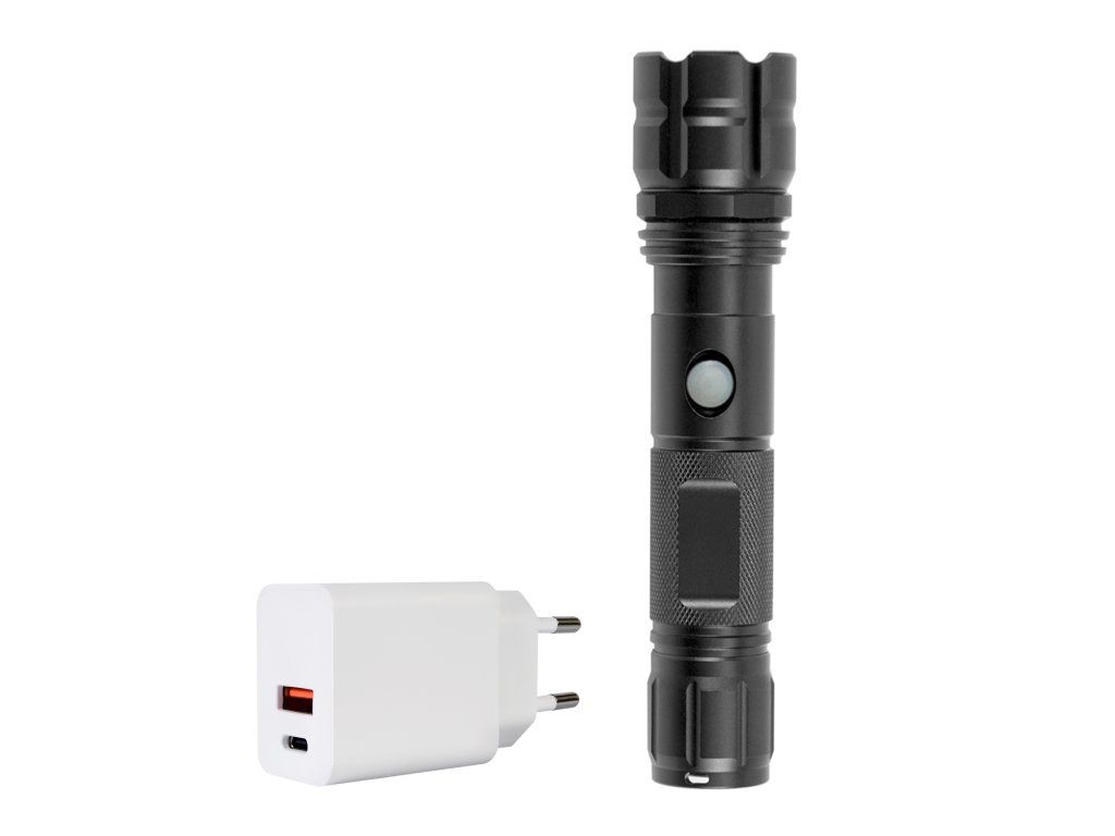Balenie hliníkovej baterky PNI Adventure F10 s LED 6W, 500lm do ohniska 200m, s batériou a napájaním PNI CHG300 s USB C portom, QC3.0, PD3.0, PPS a USB-A port, 30W