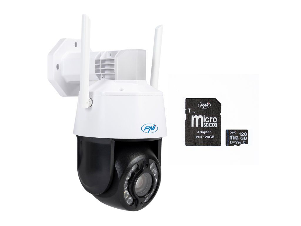 Balenie PNI House IP575 5MP WiFi video monitorovacia kamera s IP + PNI 128GB MicroSD pamäťová karta s SD adaptérom
