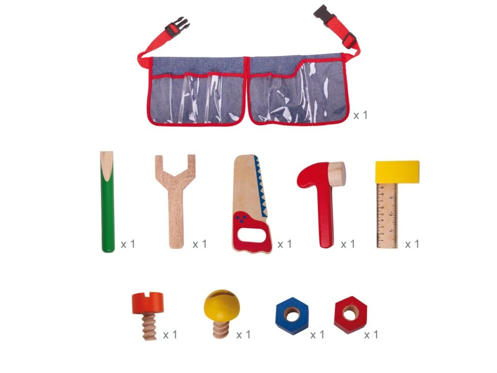 Tento prvý opasok na náradie sa skladá z bezpečných drevených predmetov, ktoré deťom umožnia objavovať radosť z opráv a vytvárania vecí. Každá drevená pomôcka má ideálnu veľkosť pre malé ruky a vaše dieťa určite zaujme. Pestrofarebný opasok má nastaviteľnú sponu, ktorá umožňuje vášmu dieťaťu nosiť opasok a ponechať mu voľné ruky na kreatívne hranie rolí. Pomáha rozvíjať obratnosť a koordináciu. Vyrobené z vysoko kvalitných, zodpovedne získaných materiálov. Spĺňa aktuálne európske bezpečnostné normy. Skladá sa z 10 dielov. Hlavné vlastnosti: obsahuje 10 dielovnastaviteľná sponapomáha rozvíjať obratnosť a koordináciuDodatočné parametre