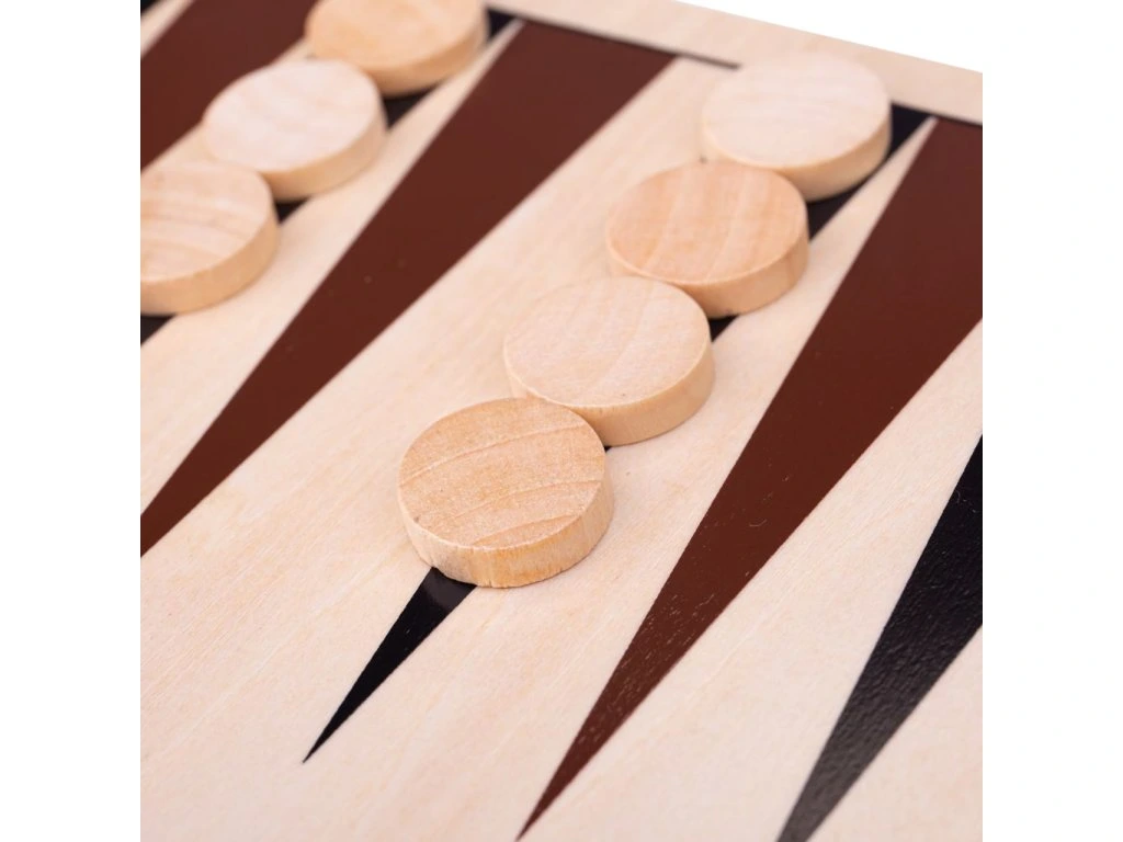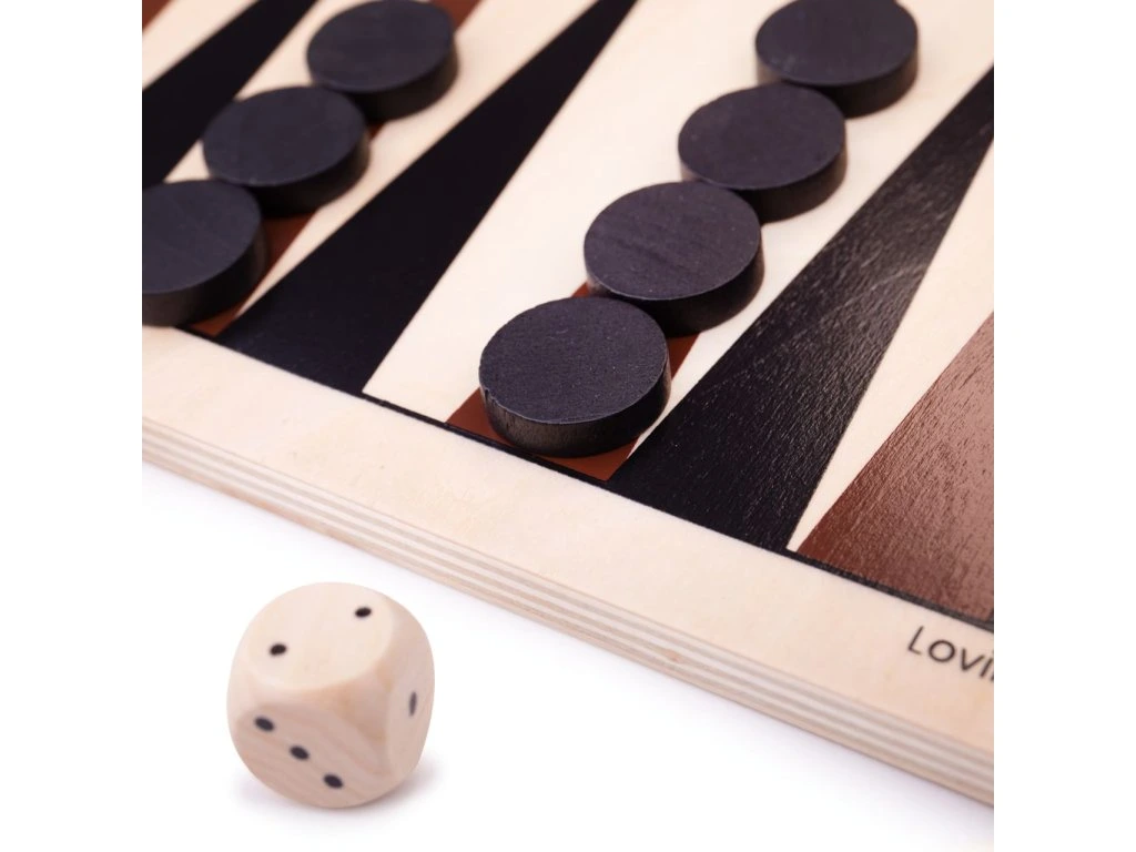 Klasická hra pre všetky vekové kategórie, u nás známa aj ako Vrhcáby, pomocou ktorej je možné rozvíjať logiku a strategické myslenie. Robustné prevedenie v prírodných farbách je zároveň odolné aj atraktívne. Skvele doplní každý herný kút, klubovňu, či kaviarenský stolík. Na výrobu hry boli použité výhradne kvalitné a zodpovedne získané materiály. Hlavné vlastnosti:hracia doska, 30 hracích kameňov, 4 hracie a 1 stávková kockapre 2 hráčovatraktívne drevené spracovanieDodatočné parametre