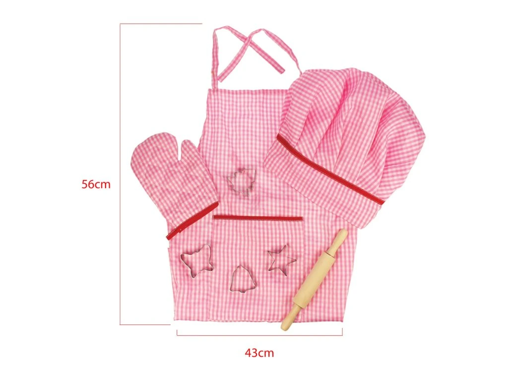 Poškodený obal. Nový tovar bez závad. Mladí kuchaři/ky budou milovat tuto světlou a pěkně růžovou bavlněnou sadu k pečení nebo vaření, která obsahuje zástěru, chňapku, kuchařskou čepici, váleček a vykrajovátka. Ideální pro použití v asistovaném vaření nebo pečení, nebo pro použití v našem dřevěném kuchyňském sortimentu jako součást hracích rolí, které si vaše dítě jistě rádo ztvární.V naší nabídce je k dispozici také sada v modré barvě. Součástí balení je vše dle obrázku. Hlavní vlastnosti: čepice: zapínání na suchý zip, obvod cca 47-51 cmrukavice: délka 17 cmzástěrka: délka: bez šňůrek 56 cm + šňůrky 29 cm, šířka 46 cm + každá šňůrka 42 cmDodatočné parametre