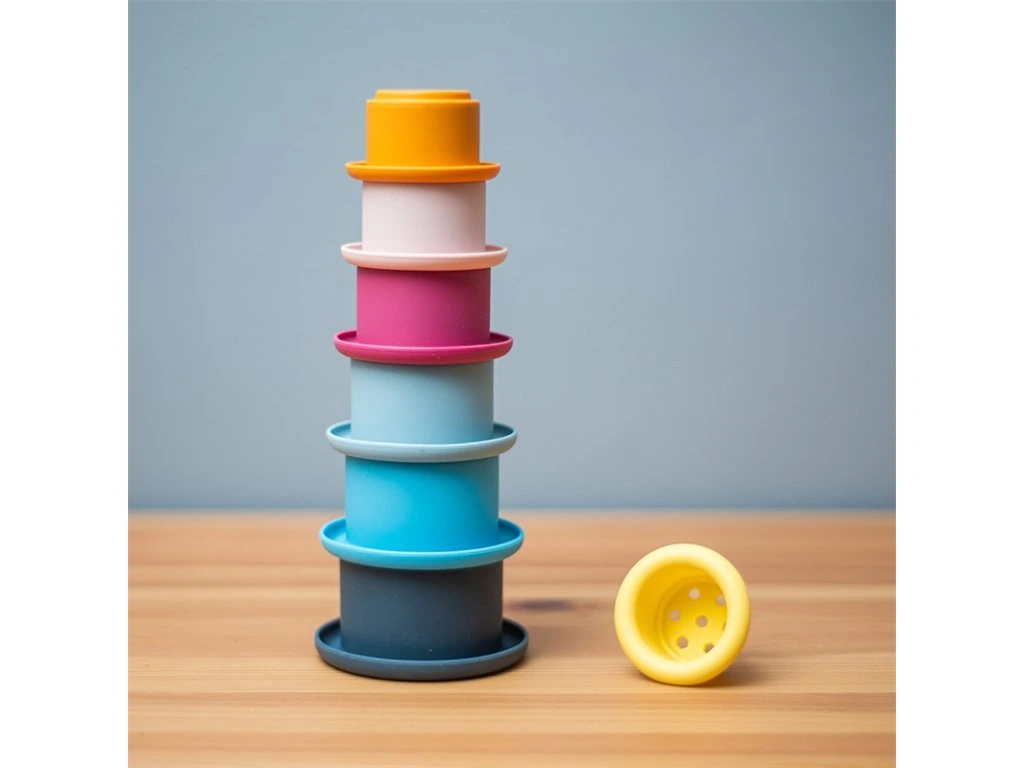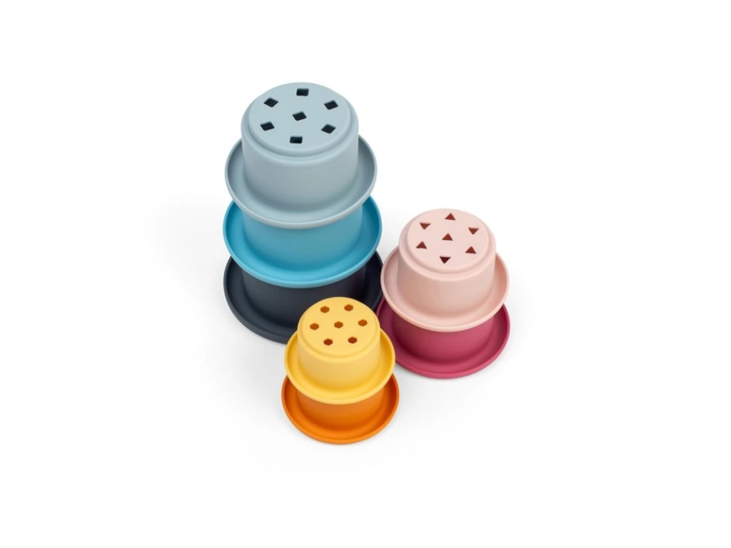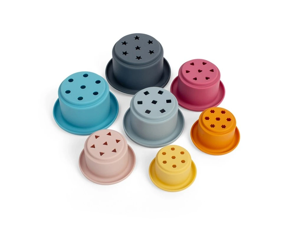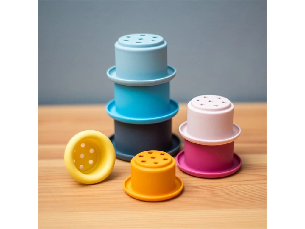 Tieto stohovacie tégliky 2 v 1 sú skvelé pre senzorické aktivity na piesku na pláži alebo vo vašej záhrade, ale aj vo vani. Sada je dodávaná so siedmimi farebnými kelímkami. Každý má vzorované otvory na základni, ktorými môže pretekať voda ako vodopád. Deti sa zábavnou formou naučia stavať, balansovať a nalievať. To všetko sú skvelé spôsoby pre rozvoj motorických zručností, koordináciu rúk a očí. Materiál je odolný, netoxický, veľmi ľahko sa čistí. Vyrobené zo 100% silikónu Čistite teplou vodou a jemným mydlom. Silikón bez plastov je udržateľnou voľbou pre rodičov, ktorí hľadajú ekologické hračky. Hlavné vlastnosti: vyrobené zo 100% silikónu bez plastov7 farebných stohovacích dielikovodolný voči teplotám a škvrnámľahko sa udržuje v čistotemožno umývať v umývačkevhodné pre deti od 1 rokaDodatočné parametre