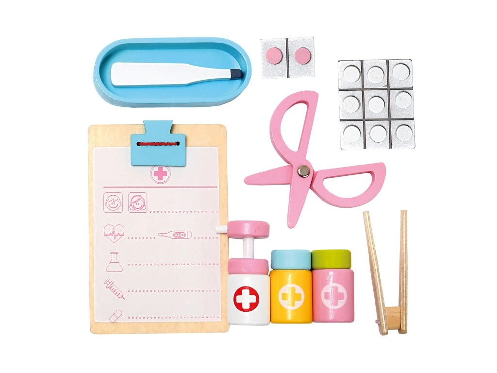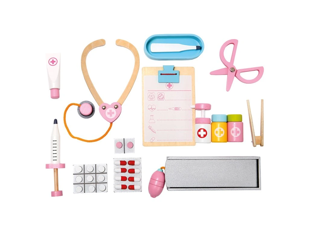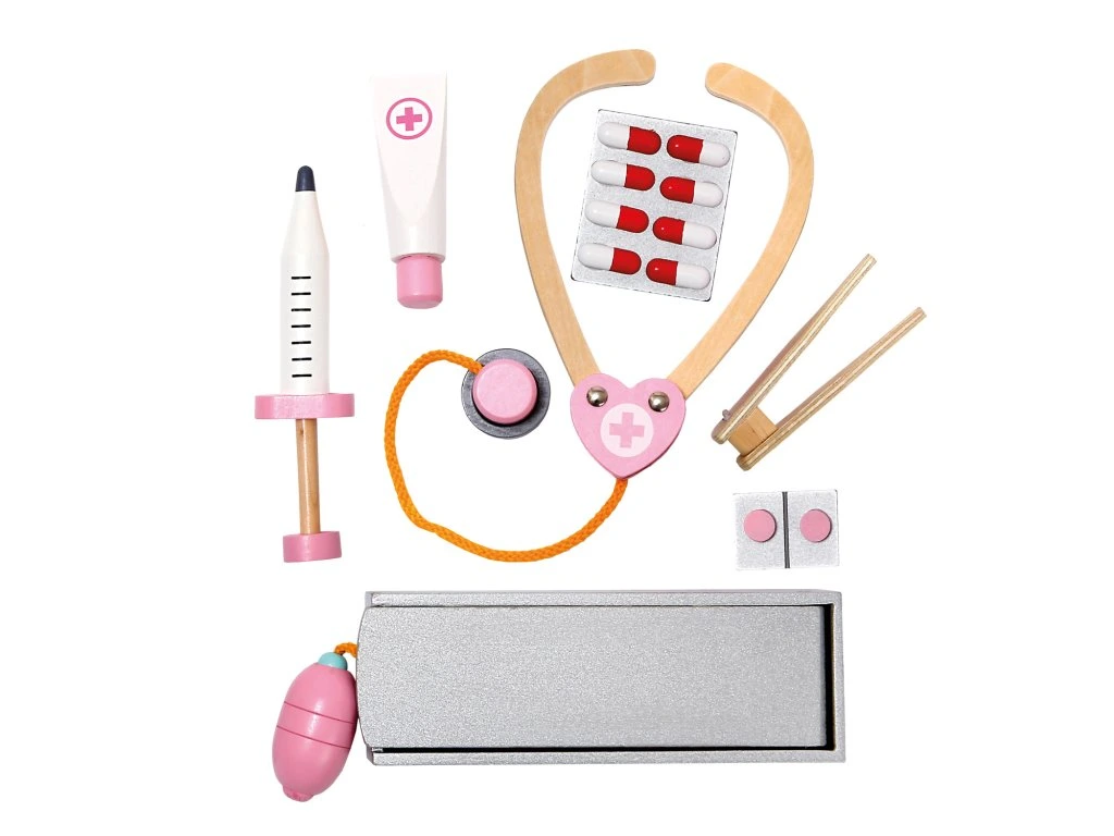 Drevený lekársky kufrík pre malé lekára. Ideálne pre hranie, u ktorých si deti skutočne dlho vyhrajú. Môžu tak preskúmavať svet dospelých a užiť si pri tom veľa zábavy. Deti kufor samy ľahko otvoria, vyjmú z neho potrebnej lekárskej náčinie a po skončení hrania ho zase znovu zloží. Rozsiahle 16-tich dielne príslušenstvo je dobre zaistené širokými gumovými pútkami. Hravou formou tak trénujú jazykové zručnosti, jemnú motoriku a podporujú svoupředstavivost. Detská zábava tak napomáha zmenšiť strach a obavy z návštevy lekára. Upozornenie: Použitie deťmi do 3 rokov len pod dohľadom dospelej osoby. Hlavné vlastnosti: rozsiahle 16-tich dielne príslušenstvodeti pri hre trénujú jemnú motoriku, podporujú predstavivosťnapomáha zmenšiť strach a obavy z návštevy lekáravhodné pre deti od 3 rokovDodatočné parametre