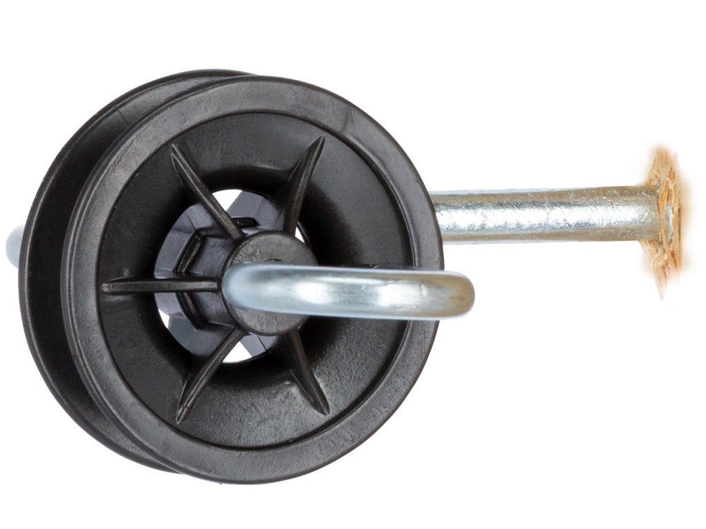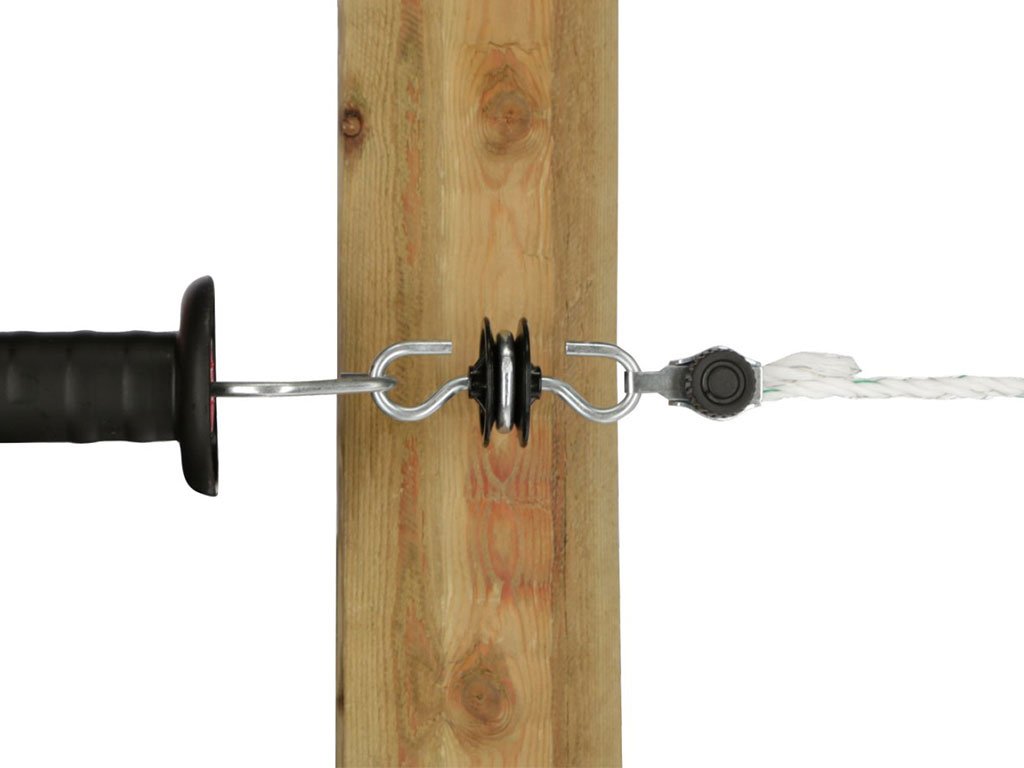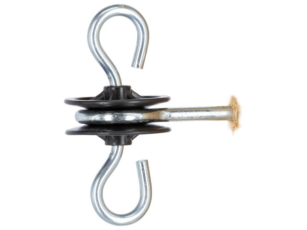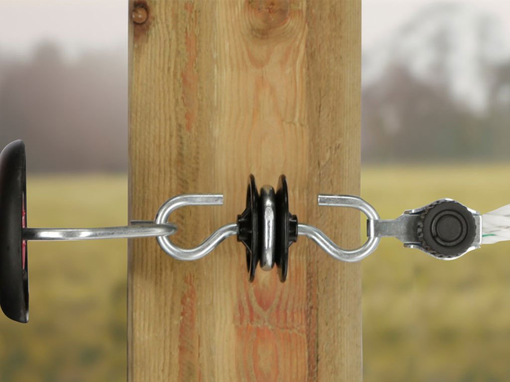 Bránový izolátor, pre elektrický ohradník, na upevnenie brány a vodiča, 360° otočné háčiky, praktické a bezpečné použitie, pozinkovaná skrutka Ø 6 mm.