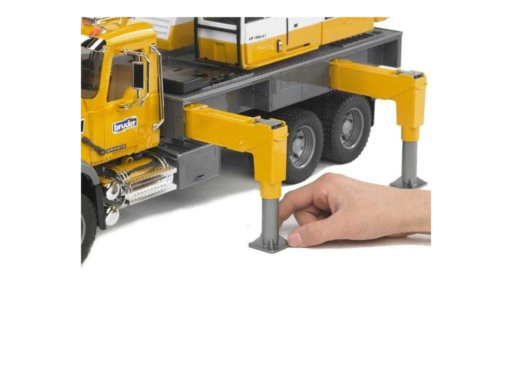 MACK Granite Liebherr autožeriav je nádherný model amerického vozu MACK Granite s chrómovými doplnkami. Žeriav v celej dĺžke čnie až do výšky 130cm !! Vysokú stabilitu vozidla majú na starosti nastaviteľné oporné nohy a môže byť tiež použitý stabilizačný segment umiestnený v zadnej časti vozidla, ktorý môže byť naplnený pieskom. MACK Granite má nový lanový navijak s blokovacím zariadením a ochranou proti preťaženiu. Lano sa dá vysunúť až do dĺžky 2m !! Výšku žeriavu je možné nastaviť pomocou regulačného gombíka s uzamykacím mechanizmom a telo žeriavu je otočné o 360 °. Kabína je zasklená vysoko odolným priehľadným polykarbonátom a má otvárateľné posuvné dvere. Ďalej má sklopné zrkadlá, otvárateľnou kapotu motora, profilové pneumatiky a chrómový vzhľad nárazníka, predného rámu, zrkadiel a výfuku. Vyrobené v Nemecku, z kvalitných materiálov. Hlavné vlastnosti: výška až 130 cm lano vysunutelné až do dĺžky 2m telo žeriavu je otočné o 360 ° vyrobené v NemeckuDodatočné parametre