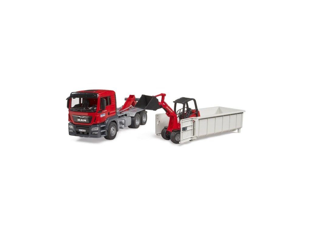 Poškodený obal. Nový tovar bez závad. MAN TGS je dokonalé univerzálne vozidlo pre stavenisko, diaľkové nasadenie a miestnu distribúciu.Vďaka odolnej konštrukcii, výkonným motorom a nadpriemernému užitočnému zaťaženiu je toto vozidlo prototypom často popisovaného "všestranného vozidla" s množstvom inovácií na palube.Dvojfarebná kabína je vybavená otvárateľnými dverami, ktoré poskytnú moderne vybavené pracovisko každej postave z Bsveta.Prepravný kontajner má na konci dvoje otočné výklopné dvere a je možné ho spustiť a vzadu opäť zdvihnúť pomocou ramena chápadla.Keď kontajner stojí na podlahe a dvere sú otvorené, môžu do kontajnera vojsť aj menšie vozidlá BRUDER, ktoré potom kontajnerové nákladné vozidlo prevezie.Táto možnosť sa v reáli veľmi často využíva na stavbách a malí stavitelia si môžu tieto flexibilné možnosti zopakovať v detskej izbe.Do tejto skvelej kombinácie je teraz zahrnutý aj obľúbený nakladač Schaeff na dvore. Hlavné vlastnosti: otváracie dvere autakaroséria auta má otváraciu kapotu motorakontajner je možné spustiť alebo zdvihnúťodnímateľný zadný záves nakladačaKĺbové riadenie nakladačaNastaviteľná a odnímateľná čelná radlica nakladačakompatibilný s figúrkami Bworldvyrobené z vysoko kvalitných plastovvyrobené v NemeckuDodatočné parametre