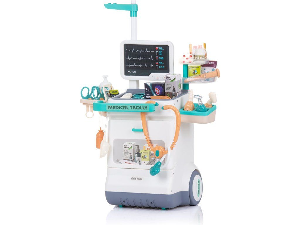 Hrací sada pro děti podněcuje představivost, pomáhá dětem osvojit si různé dovednosti a zlepšuje jejich výkonnost v modelovém scénáři. Při hře se děti učí specifickým dovednostem o různých profesích, výrobcích a činnostech. Vlastnosti: obsahuje 26ks příslušenství - vozík na příslušenství s policemi, rentgenový panel s osvětlením, vyměnitelné šablony se snímky plic, páteře, ruky a také EKG, stetoskop, kapačka, kyslíková maska s lahví a další doplňky, interaktivní hračka se zvuky a světly, pro provoz jsou třeba baterie: 2ks AAA,1,5 V (nejsou součástí balení), rozměry vozíku (ve složeném stavu): 115 x 46,5 x 26,5 cm. Tato hračka byla vyrobena v souladu s požadavky evropských směrnic a norem v souvislosti s bezpečností hraček.Dodatočné parametre