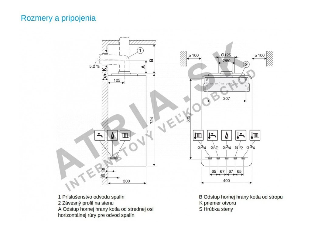 - Připojení koncentrického potrubí spalin/spalovacího vzduchu Ø 60/100 mm nebo Ø 80/125 mm nebo samostatného potrubí Ø 80 mm.