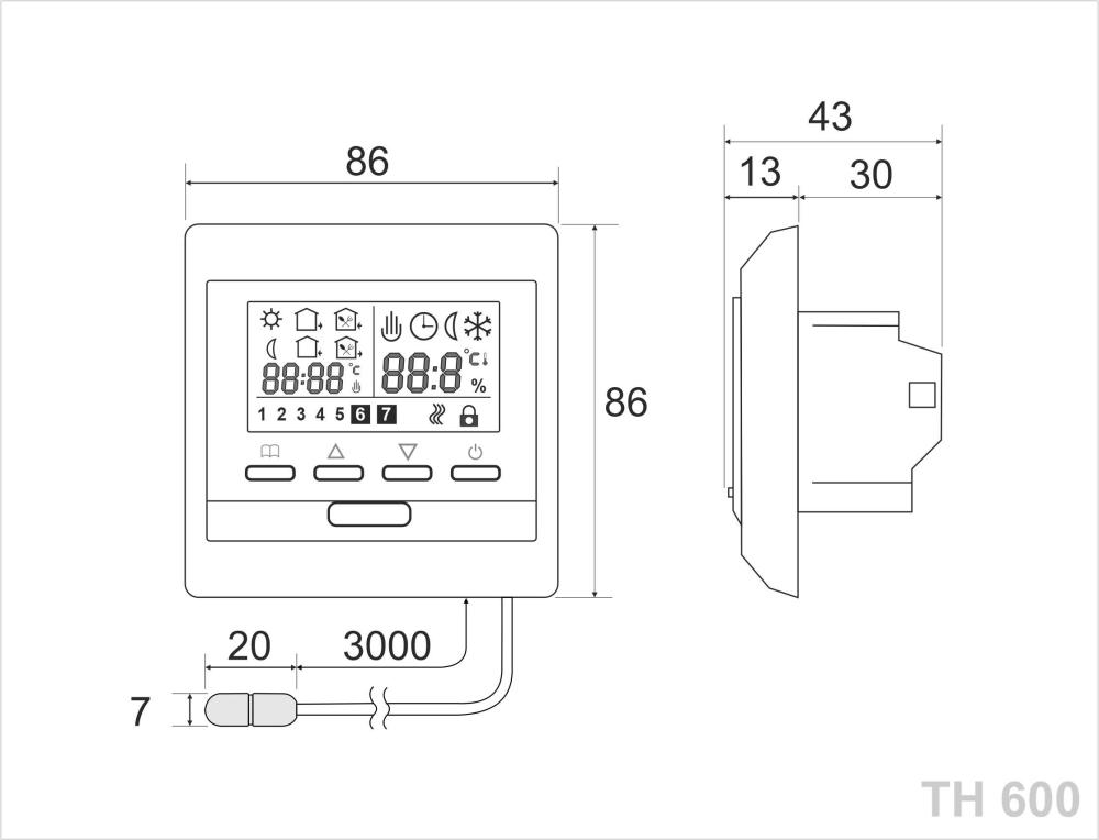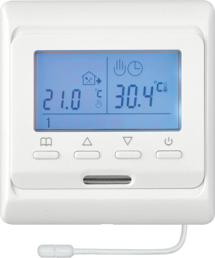 Termostat so vstavaným snímačom,predĺženým podlahovým snímačom 3m dlhým a s programovateľným, týždenným časovým spínačom. Pri týždennom cykle je možné nastaviť šesť časových úsekov pre každý deň s rôznou teplotou. Možnosť výberu automatického alebo manuálneho režimu. Termostat je určený pre ovládanie dvoch teplôt, kde jedna je primárna (meranie teploty v prietore) a druhá je iba limitovaná (meranie teploty podlahy).