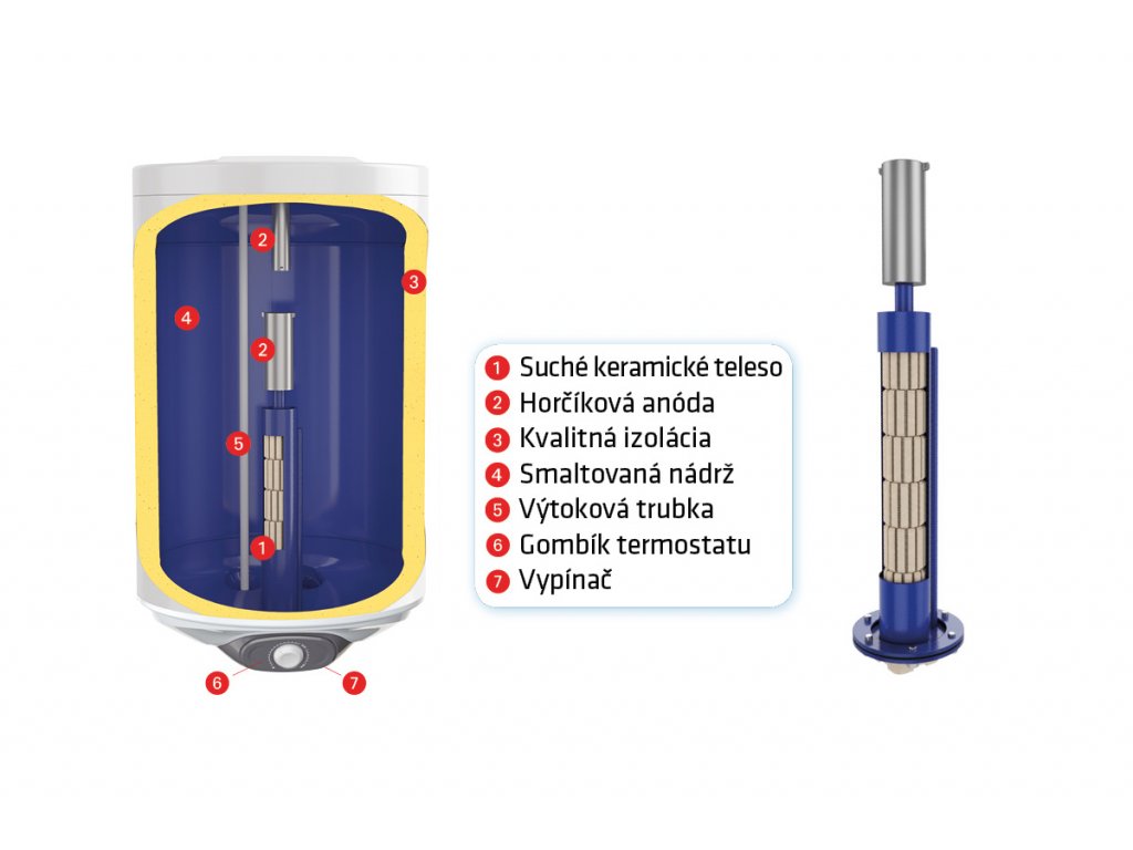 Elektrický tlakový ohřívač vody Eliz EURO 101 se suchým keramickým topným tělesem je ideálním řešením pro oblasti s tvrdou vodou. Suché keramické topné těleso není ponořeno do vody, ale je umístěno v kovovém přírubovém pouzdře, takže nedochází k rychlému usazování vodního kamene. Je vhodný pro jedno nebo více odběrných míst a je určen pro svislou montáž na stěnu.