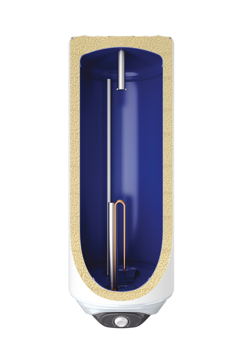 Nádrž ohřívače vody je vyrobena z vysoce kvalitní oceli chráněné vrstvou zirkoniového smaltu. Vysoce kvalitní polyuretanová bezfreonová polyuretanová izolace o tloušťce 33 mm zaručuje nízké tepelné ztráty a úsporu nákladů na ohřev vody. Pomocí termostatu na ovládacím panelu můžete nastavit teplotu vody v rozmezí 7-75 °C, s možností nastavení režimu ECO. Při nastavení úsporného režimu se voda ohřívá na optimální teplotu 55 °C, čímž se snižují tepelné ztráty a spotřeba elektrické energie. Minimální hodnota termostatu slouží jako ochrana proti zamrznutí vody v ohřívači. Ohřívač má zabudované dvě anodové tyče, které zaručují účinnou ochranu nádrže proti korozi a výrazně prodlužují její životnost. Spínač osvětlení topení slouží k zapnutí/vypnutí topení v případě naší nepřítomnosti, čímž šetří energii.