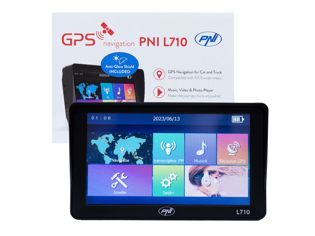 GPS navigačný systém PNI L710 so slnečnou clonou, 7 palcový, 800 MHz, 256 MB DDR, 16 GB interná pamäť, FM vysielač, súčasťou balenia sú dva napájacie zdroje do auta