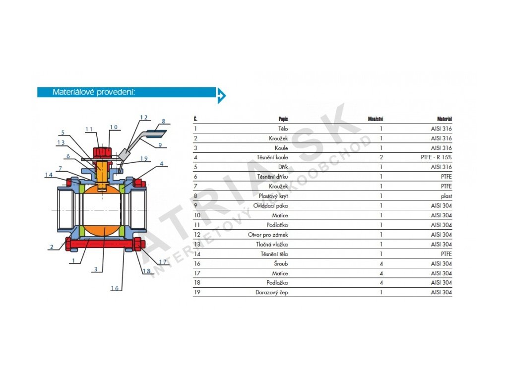 - materiál těla: nerezová ocel A351 CF8M, kulička a stopka z nerezové oceli AISI 316