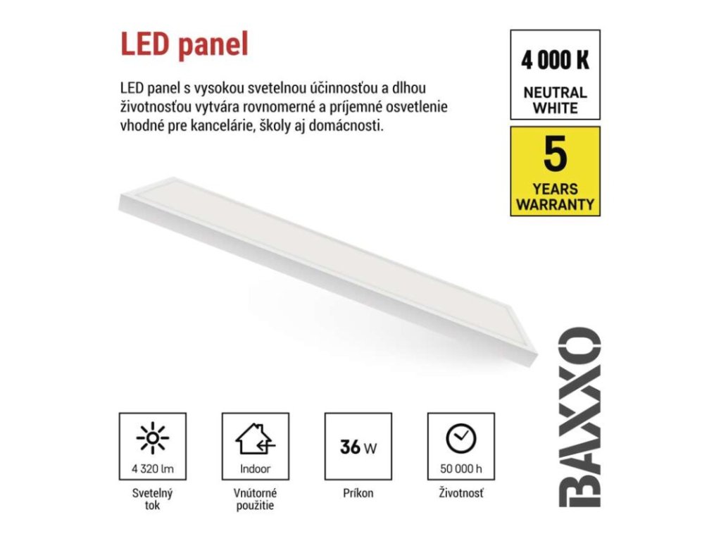 LED panel BAXXO 30×120, obdĺžnikový prisazeny biely, 36W neutr. b.