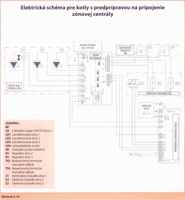 ZÓNY: V rámci tohoto schématu lze systém rozdělit do neomezeného počtu zón, ale žádnou z nich nelze ovládat dálkovým ovladačem CAR nebo Super CAR. Zóna s otopnými tělesy s přívodem přes zónový ventil musí být vždy první zónou (č. 1 - tj. ta před anuloidem). Zónová čerpadla nebo ventily lze napájet přes příslušné termostaty prostředí, i když je kotel nastaven na letní režim nebo prioritu TUV. To nemá negativní vliv na provoz kotle, ale přesto se doporučuje vypnout externí čerpadla během letního režimu.