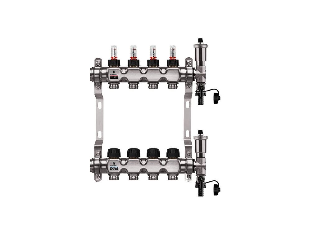 Podlahový rozdeľovač WIGELL, 4 okruhy, nerez + automatické odvzdušňovanie