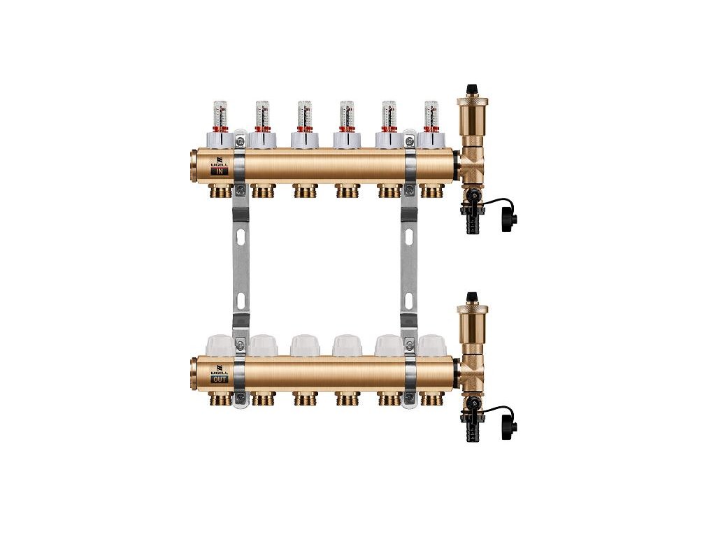 Podlahový rozdeľovač WIGELL, 6 okruhov, mosadzný + automatické odvzdušňovanie