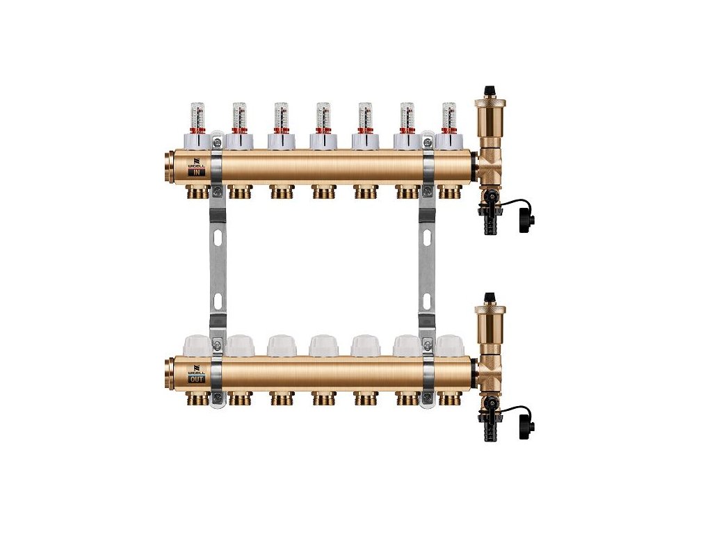 Podlahový rozdeľovač WIGELL, 7 okruhov, mosadzný + automatické odvzdušňovanie