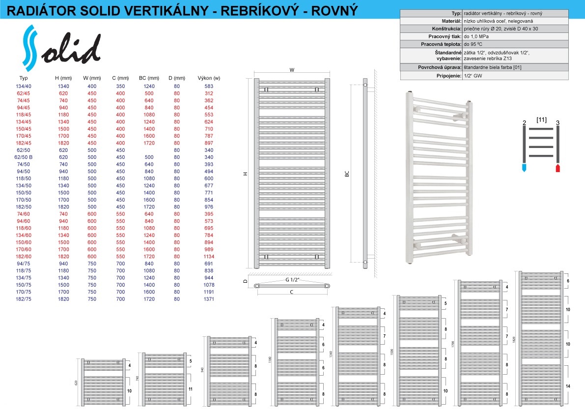 | Dodávané príslušenstvo: | Rebríkový radiátor rovný, držiaky, hmoždinky, matky, skrutky, odvzdušňovací ventil |