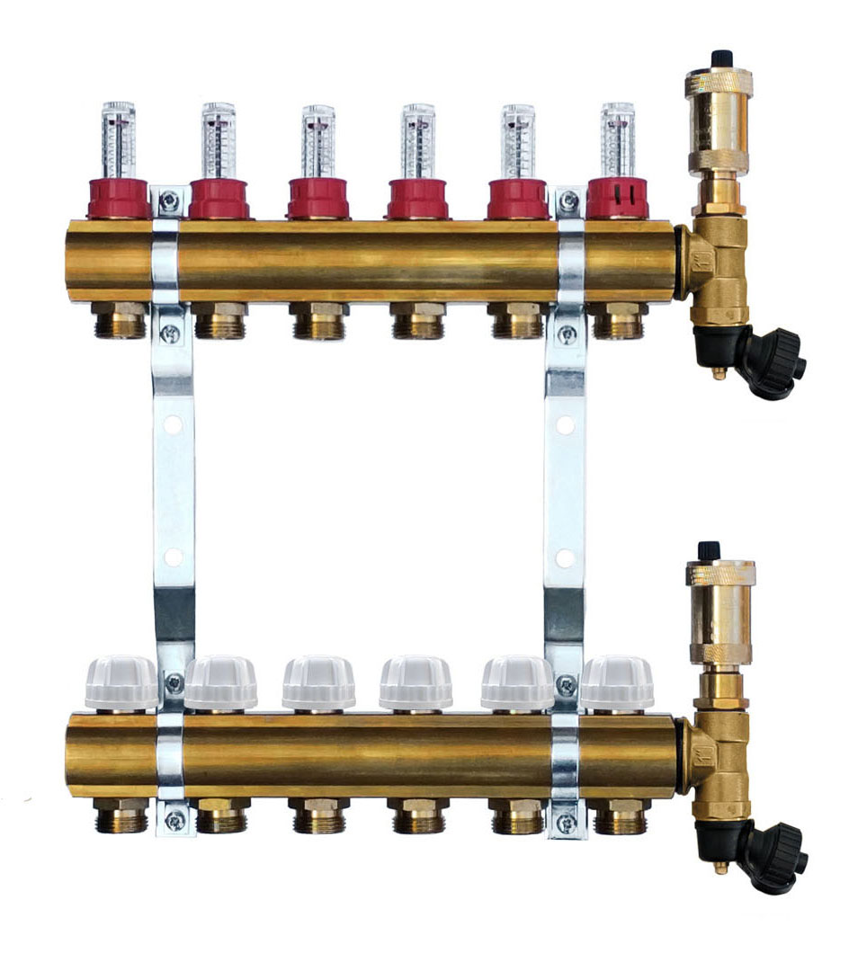 Mosazný 6cestný rozdělovač pro podlahové vytápění, připojení 1"