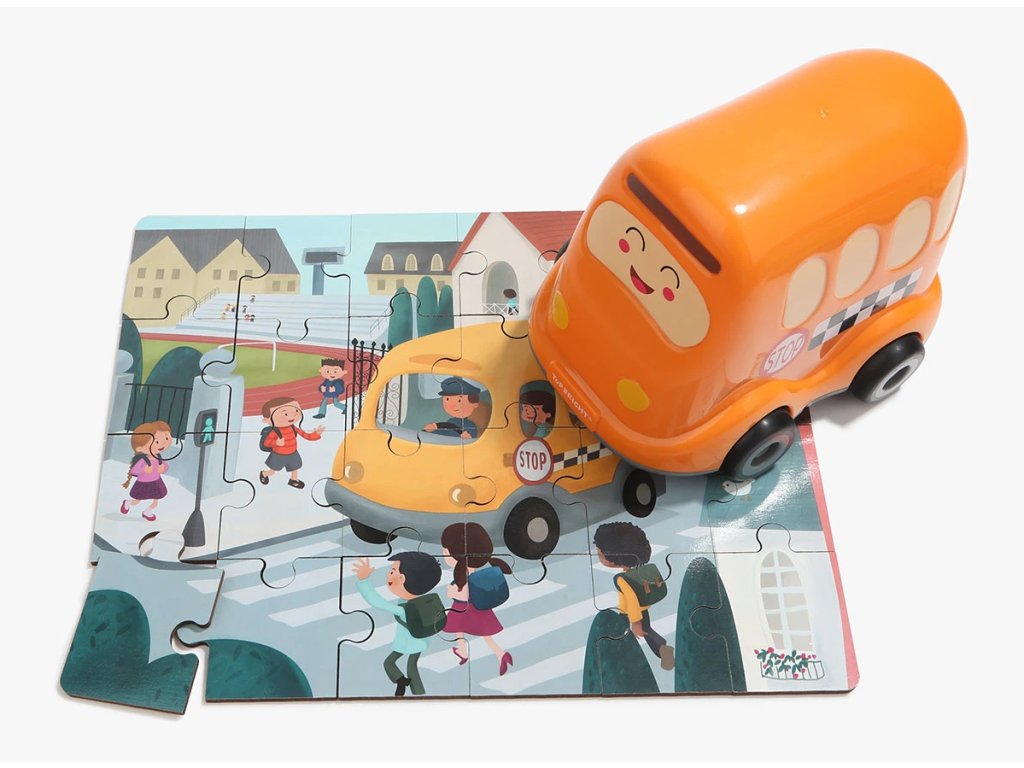 TOP BRIGHT Dřevěné puzzle s hračkou: Školní autobus 24 dílků