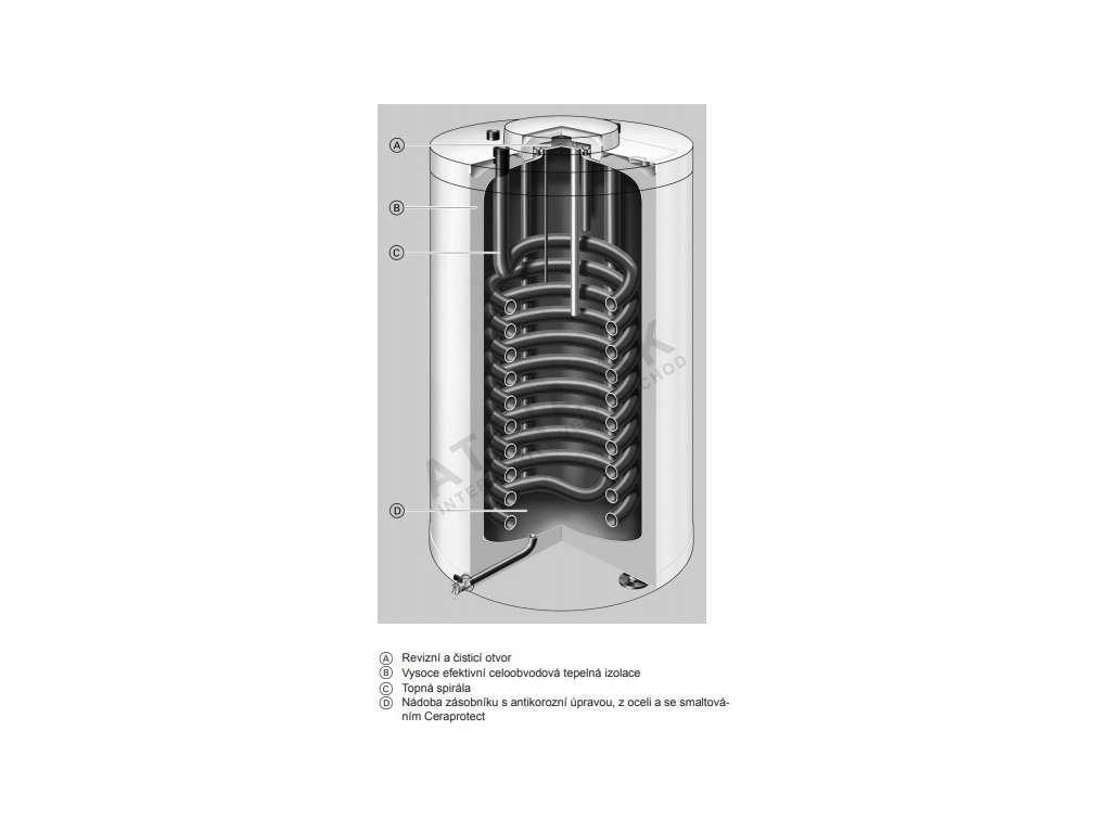 -- Ohřev celého obsahu vody pomocí topné spirály vedené hluboko na dno nádrže
