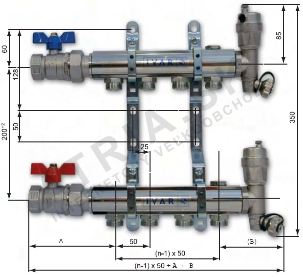 • Sestava obsahuje: rozdělovač a hlavice, montážní držáky, kulové uzávěry přívodu, ukončení s automatickým odvzdušňovacím ventilem a otočným vypouštěcím ventilem a zátkami
