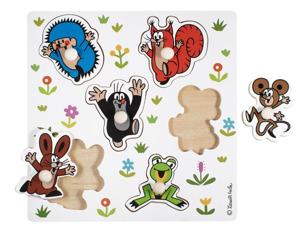 Vkladacie puzzle Krtka a jeho priateľov. Priraďte každý dielik postavičky k správnemu otvoru na základnej doske. Dieliky sú jednoducho uchopiteľné pomocou úchytu, ktorý má každá postavička. Vďaka týmto úchytom je pre malé rúčky ľahké zdvíhanie, uchopovanie, skúmanie aj vymieňanie každého dielikov. Pomáha rozvíjať obratnosť, motorické zručnosti a koordináciu ruka-oko. Vyrobené z vysoko kvalitných materiálov zo zodpovedných zdrojov. Hlavné vlastnosti: pestrofarebné postavičky s úchytomrozvíja obratnosť a koordináciu ruka-okovyhrajú si s nimi šikulové od 2 rokovvyrobené v ČR© Zdeněk MilerDodatočné parametre