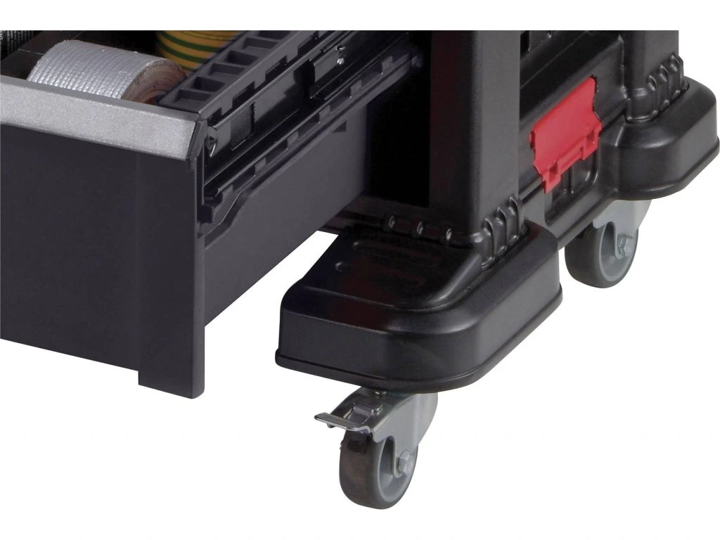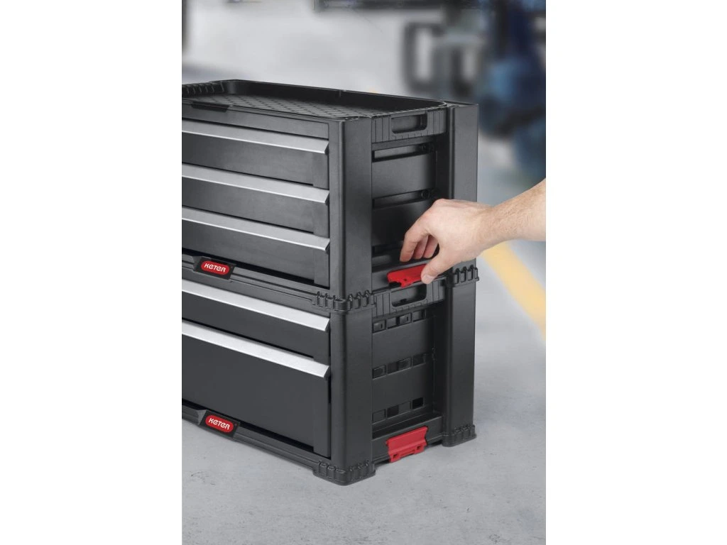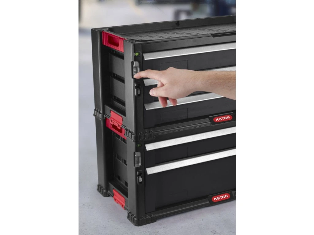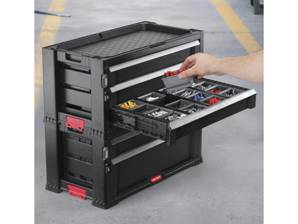 Úložný box na náradie obsahuje jednu hlbokú zásuvku s odnímateľnými priehradkami, do ktorej môžete uložiť veľké a ťažké nástroje. Ďalšie 4 zásuvky slúžia na uloženie drobnejších nástrojov a príslušenstva. Jedna zo štyroch menších zásuviek je vybavená 16 vyberateľnými organizérmi na drobné príslušenstvo, ako sú klince, skrutky, hmoždinky a iné drobnosti. Organizéry umožňujú ľahké roztriedenie príslušenstva podľa druhov a veľkostí. Všetky deliace priečky v zásuvkách je možné ľahko vybrať a vytvoriť tak voľný priestor pre väčšie nástroje. Každý samotný blok so zásuvkami je možné zaistiť proti otvoreniu vstavaným posuvným zámkom. Nechýba ani očko na zaistenie visiacim zámkom.