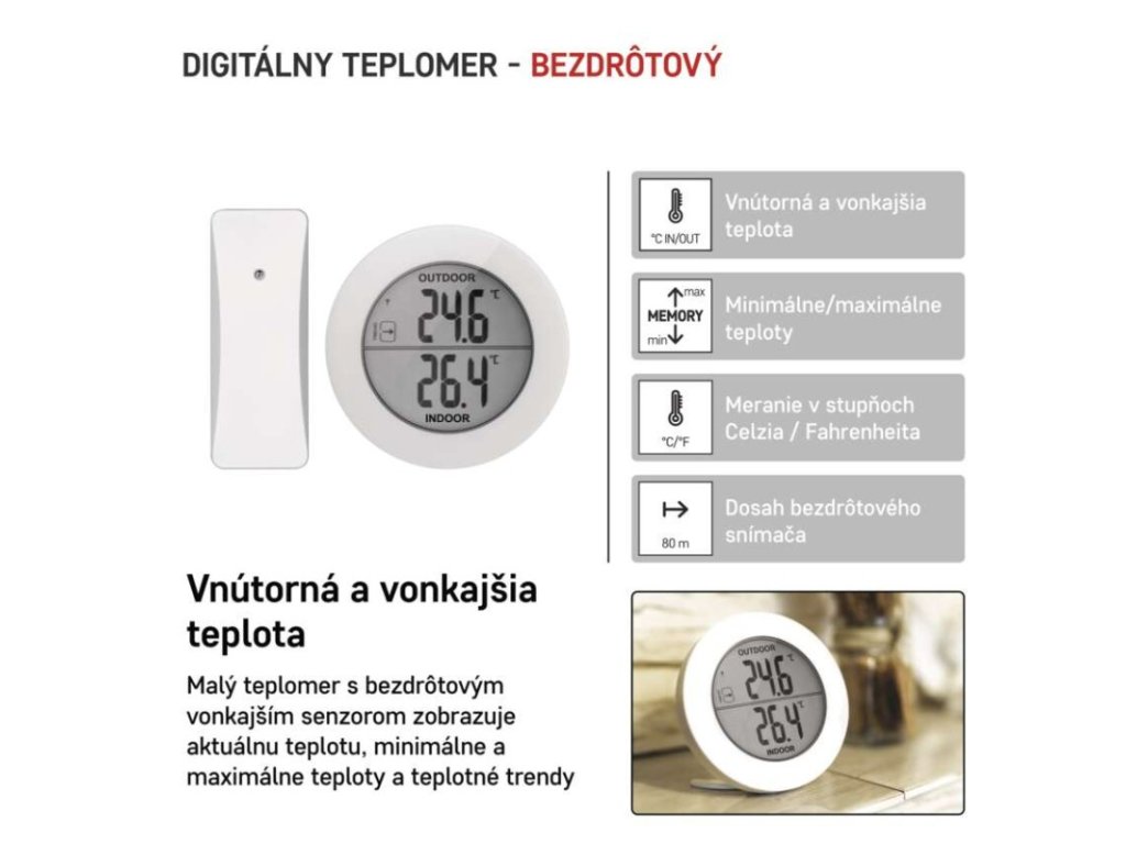 vonkajšia teplota: -30 °C až +50 °C, rozlíšenie 0,1 °C