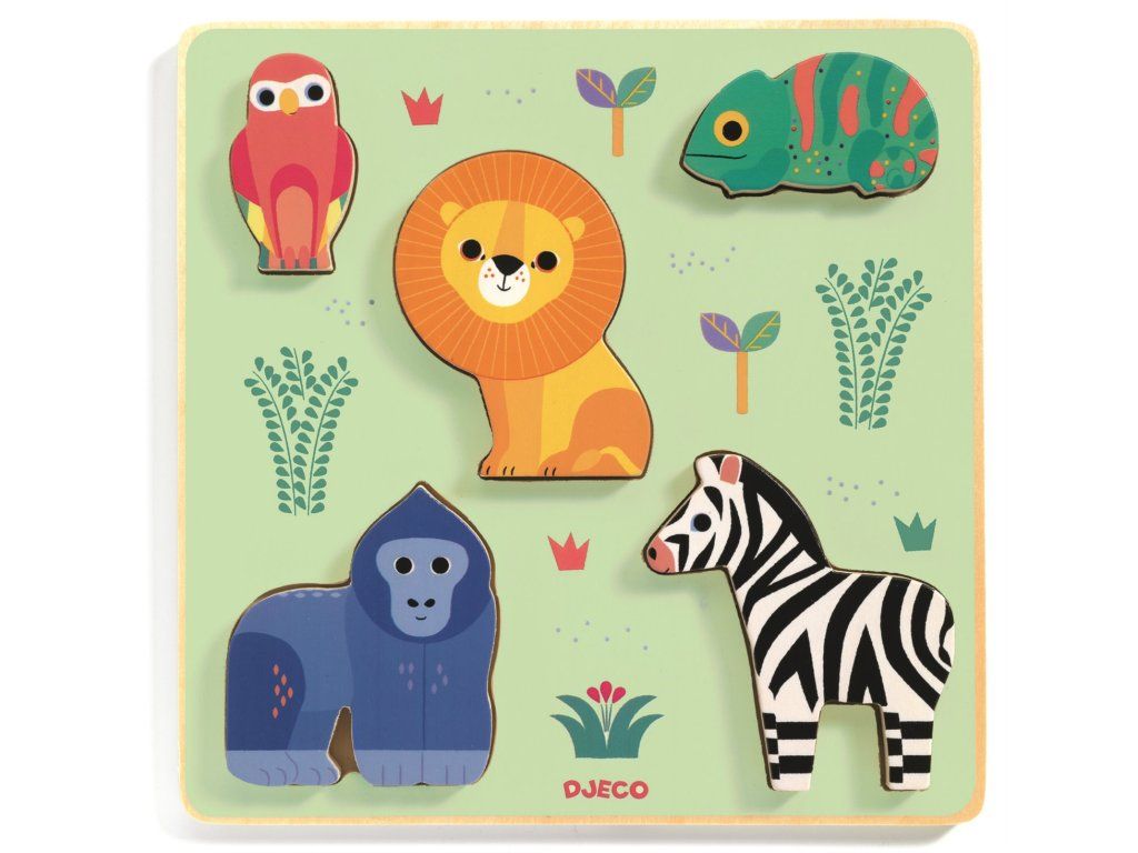 Dětská vkládačka z přírodního materiálu s pěti vkládacími obrázky divokých zvířátek. Dítě se podle obrysů a tvaru snaží najít správný obrázek (rozvoj představivosti a logického myšlení), a umístit jej do správného otvoru (rozvoj jemné motoriky). Doporučeno pro děti od 12 měsíců.Dodatočné parametre