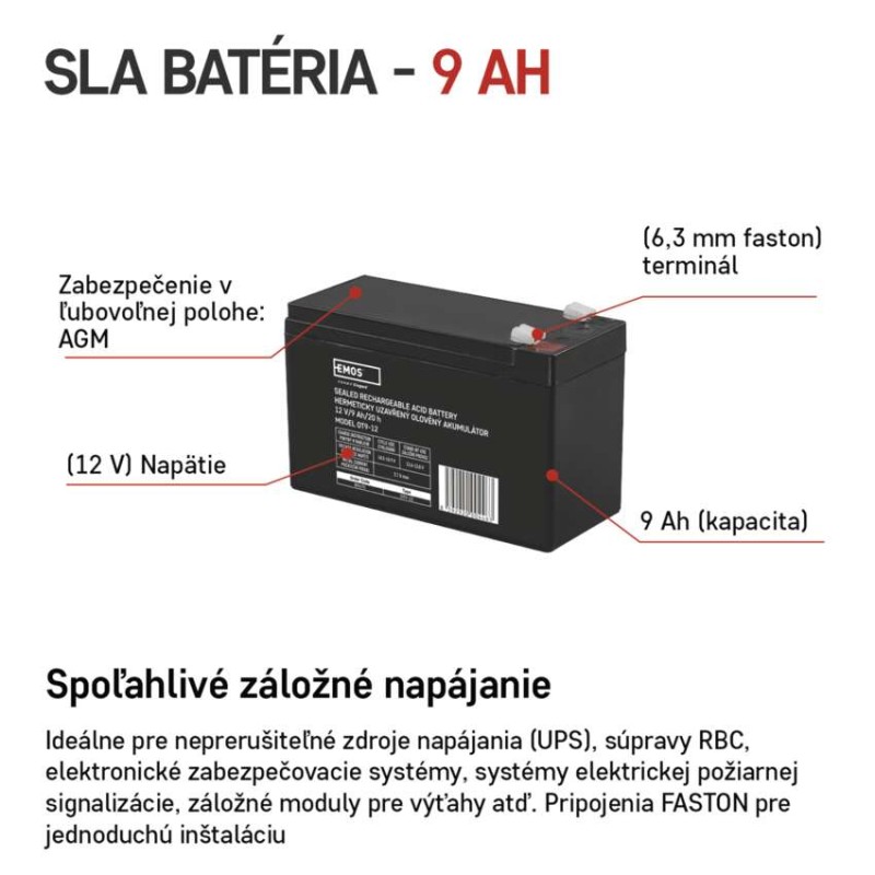 Bezúdržbový olovený akumulátor 12 V/9 Ah, faston 6,3 mm
