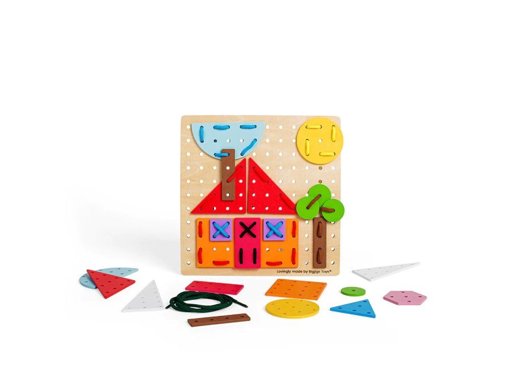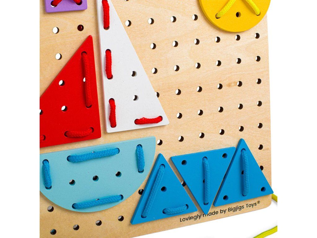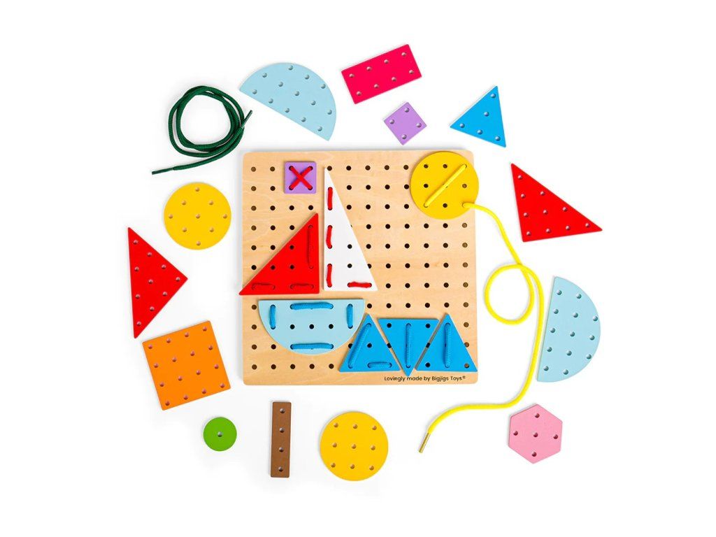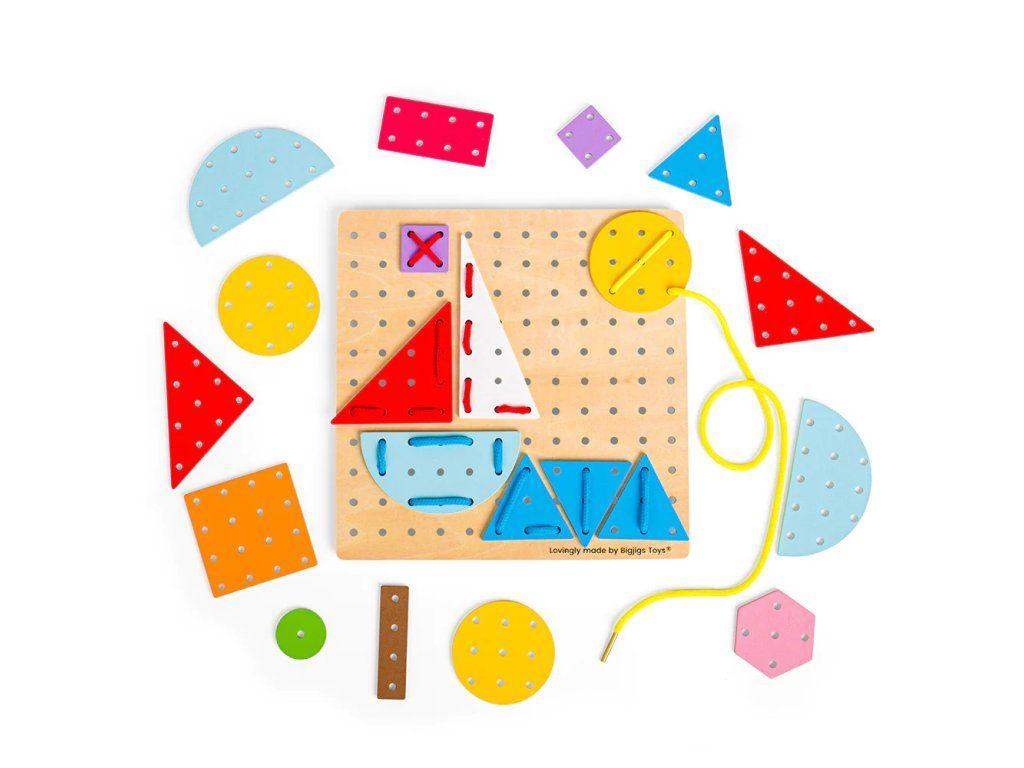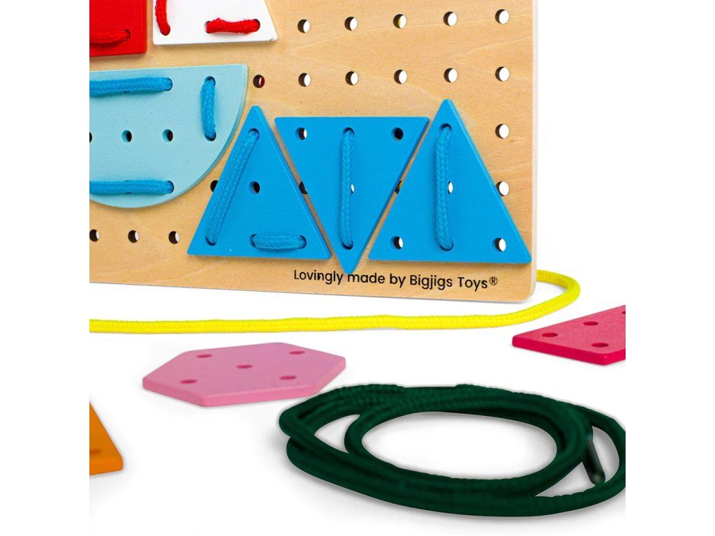 Bigjigs Toys Drevená šnurovacia hra Geometrické tvary