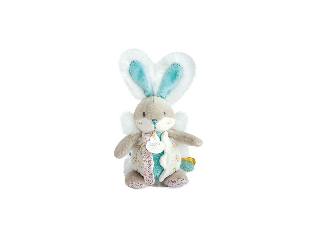 Doudou Hračka zajačik s hrkálkou a úchytom na cumlík 21 cm