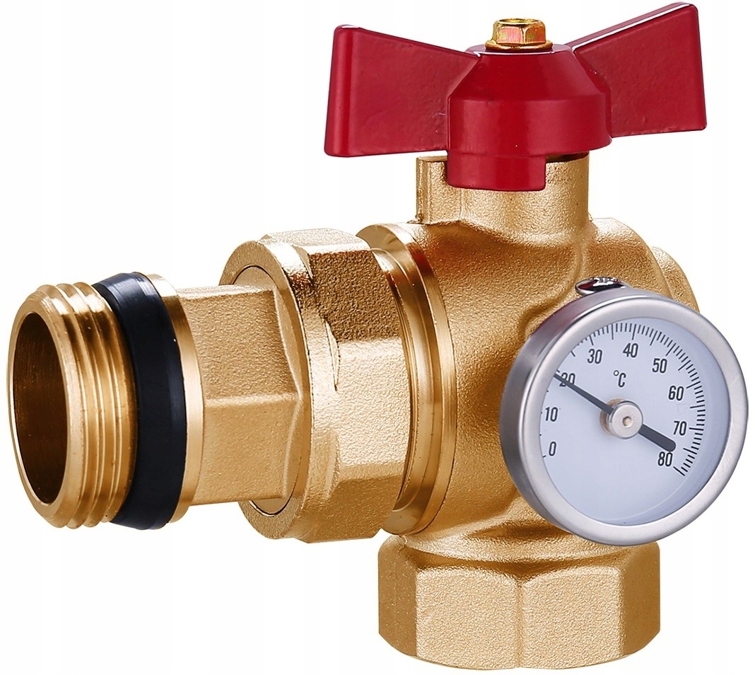 Guľový ventil rohový mosadzný pre rozdeľovač so šróbením 1" + teplomer 0°C - 80°C, ČERVENÝ motýľ