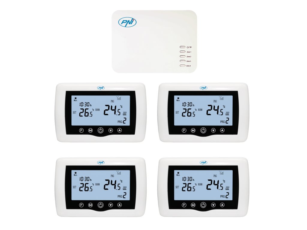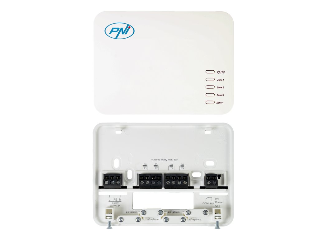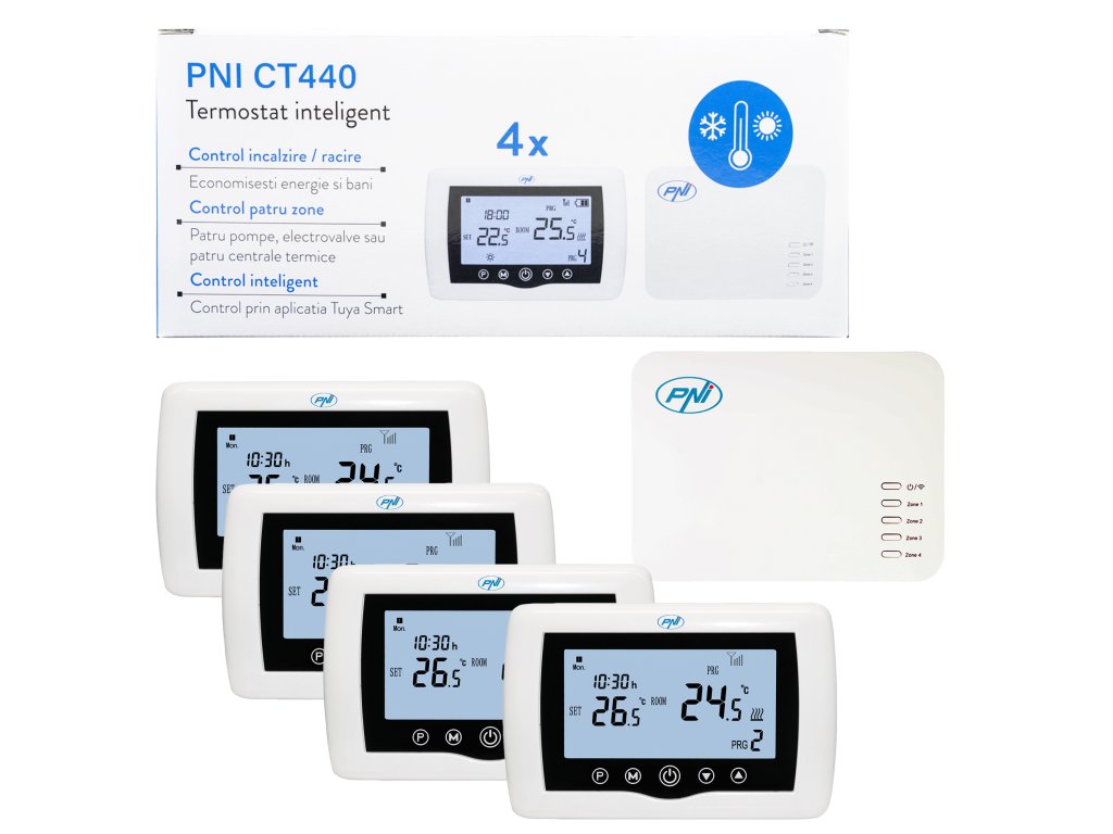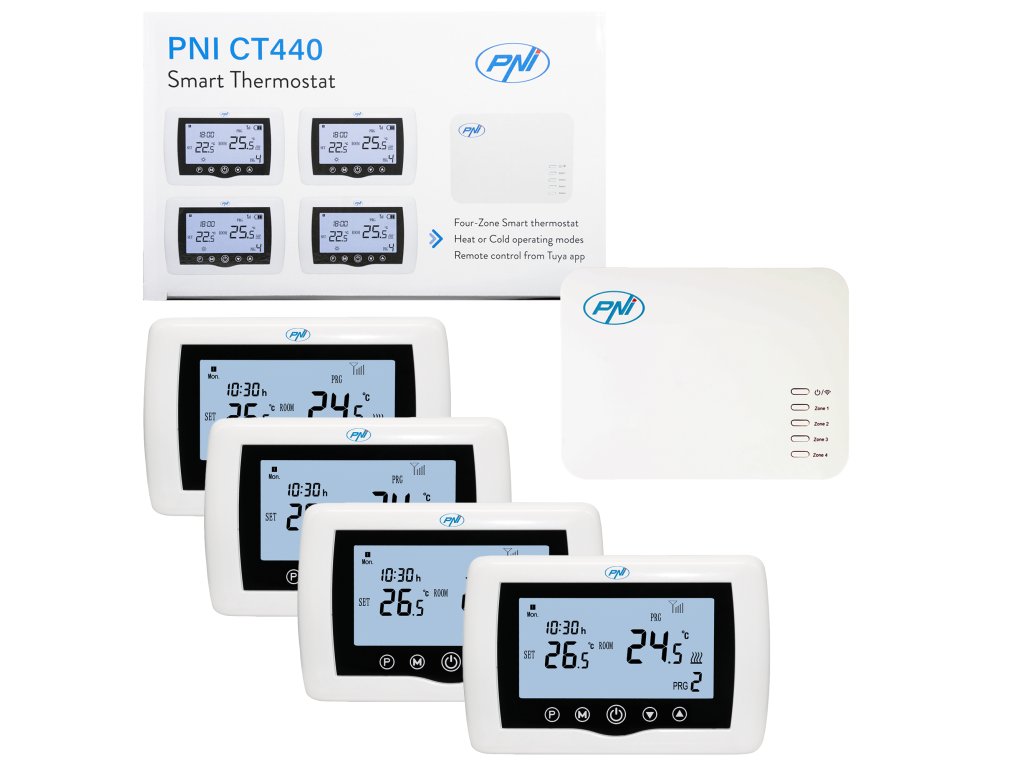 Inteligentný termostat PNI CT440 bezdrôtový, s WiFi, ovládanie 4 zón cez internet, pre teplárne, čerpadlá, solenoidové ventily, TuyaSmart APP