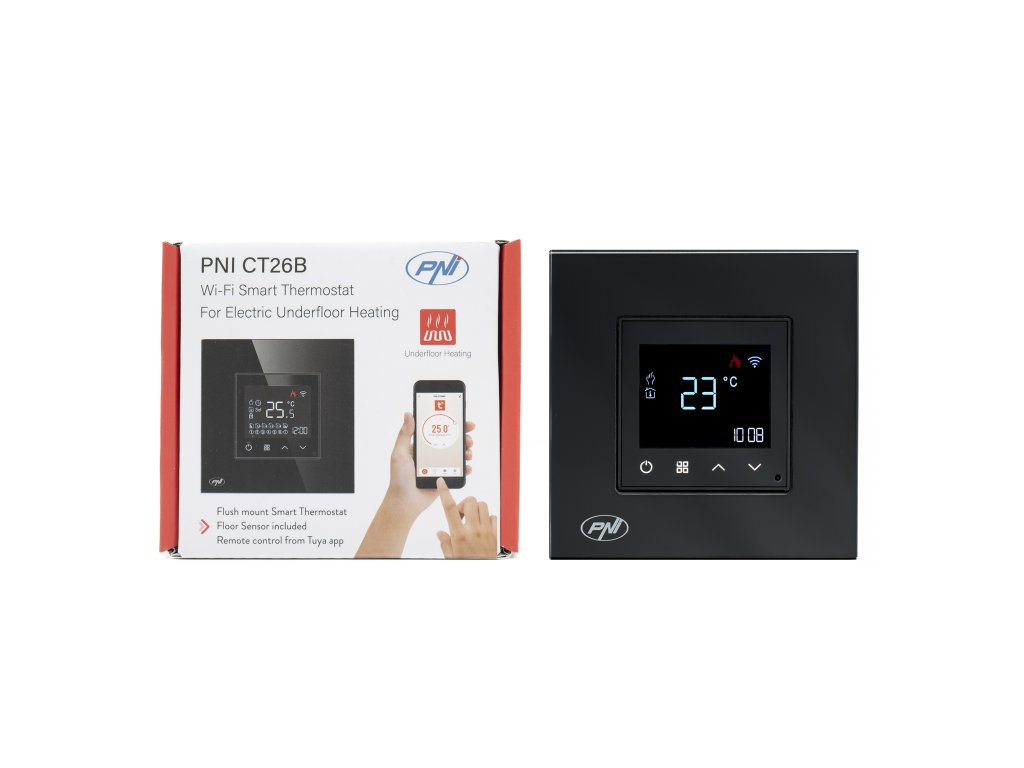 Inteligentný WiFi termostat PNI CT26B pre elektrické podlahové kúrenie alebo čerpaciu skupinu, vrátane podlahového senzora, 10 A, zapustená montáž, ovládanie z aplikácie Tuya Smart, denné programovani