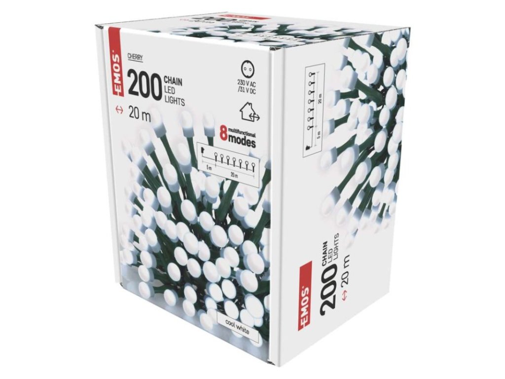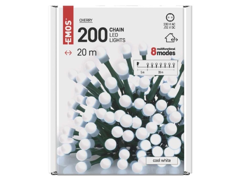 LED vianočná cherry reťaz – guličky, 20 m, vonkajšia aj vnútorná, studená biela, programy