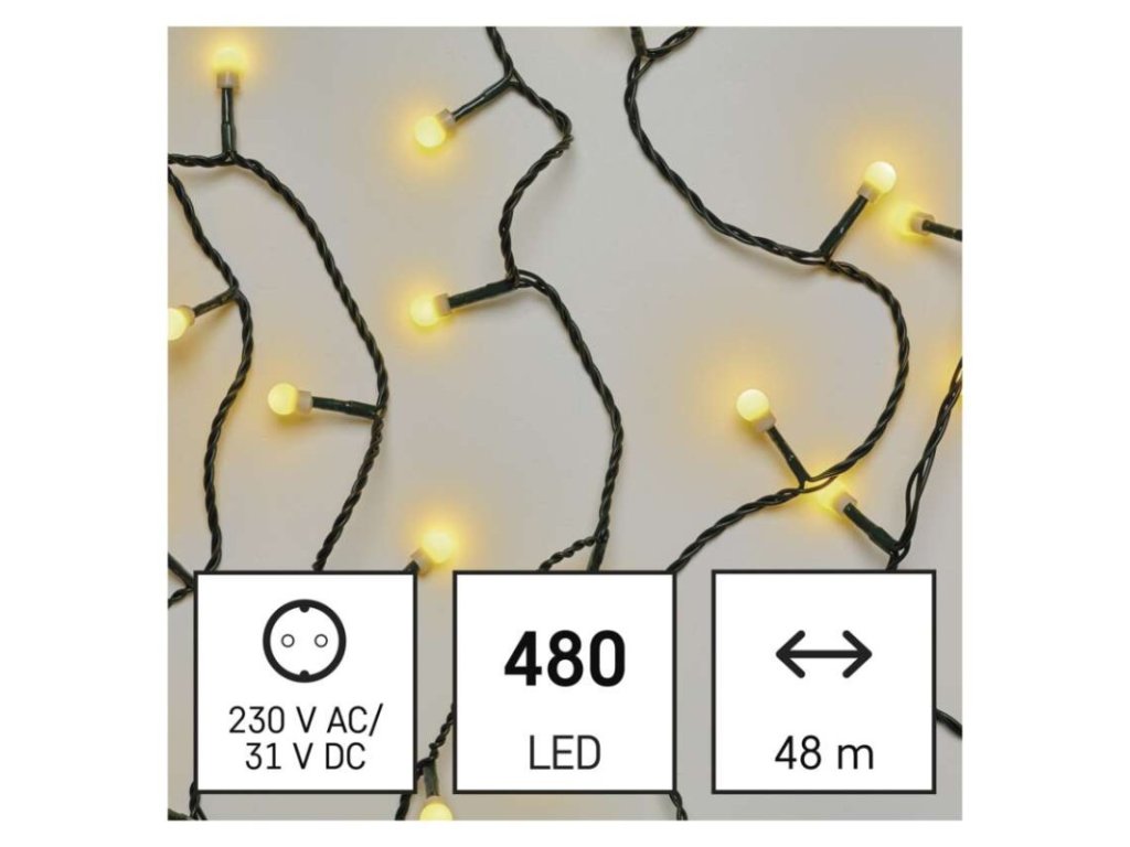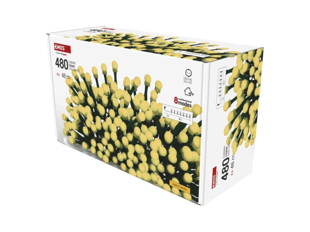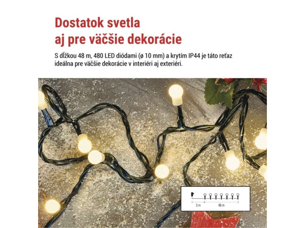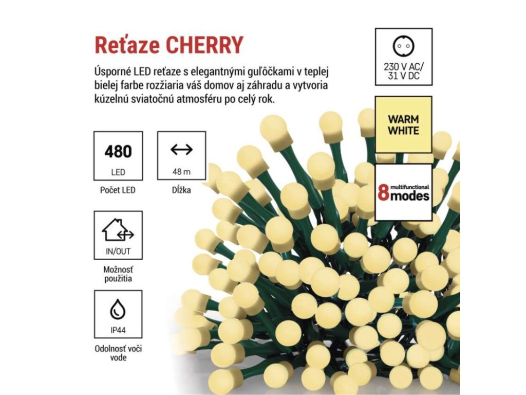 LED vianočná cherry reťaz – guličky, 48 m, vonk. aj vnútor.,teplá biela, programy, časovač
