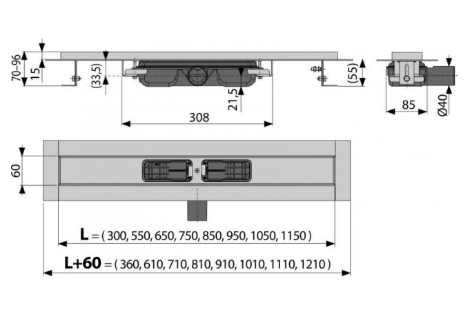 Low - Podlahový žľab s okrajom pre perforovaný rošt, dĺžka 950mm