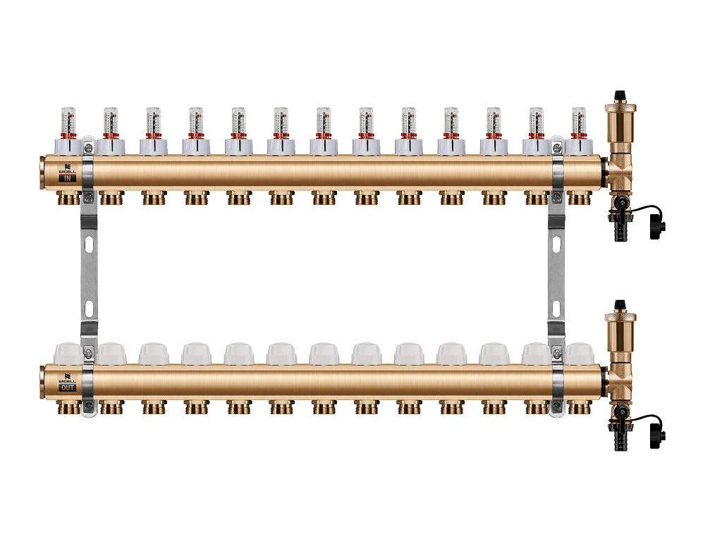 Podlahový rozdeľovač WIGELL, 13 okruhov, mosadzný + odvzdušňovanie na kľúč