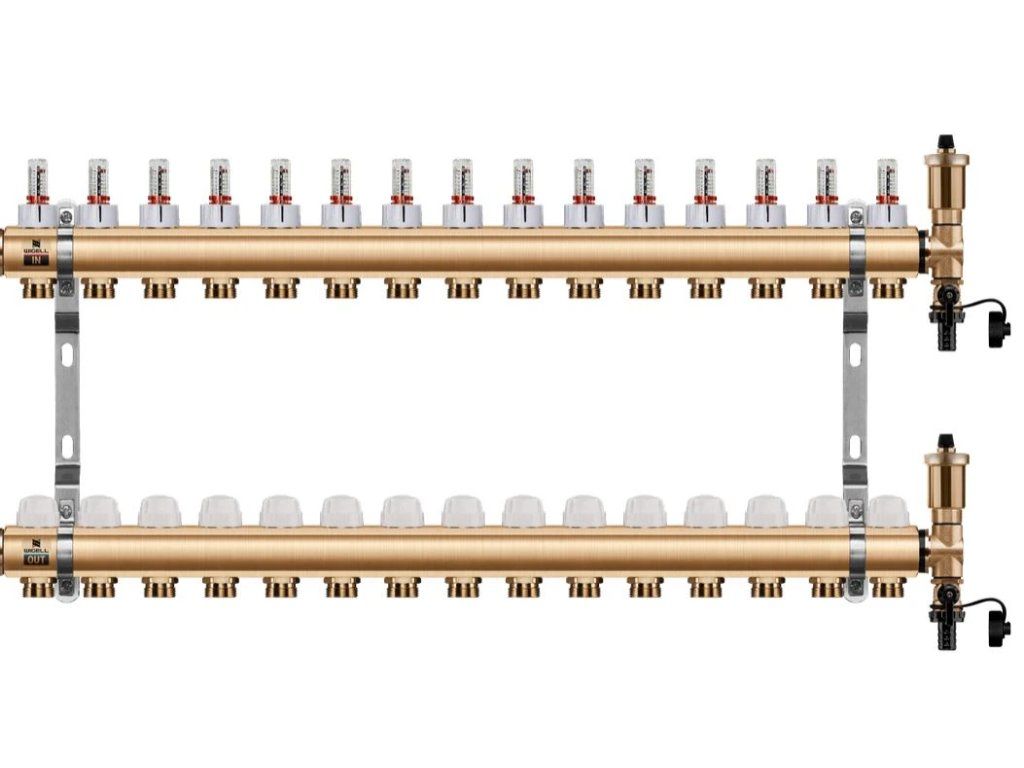 Podlahový rozdeľovač WIGELL, 15 okruhov, mosadzný + automatické odvzdušňovanie