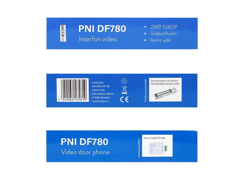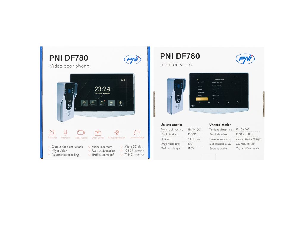 Videovrátny systém PNI DF780 s 1 monitorom, 7-palcovým displejom s rozlíšením 1080p, slotom na kartu, IP65, ovládaním 2 dverí, záznamom pohybu, maximálne 4 monitory, 2 externými jednotkami a 2 kameram